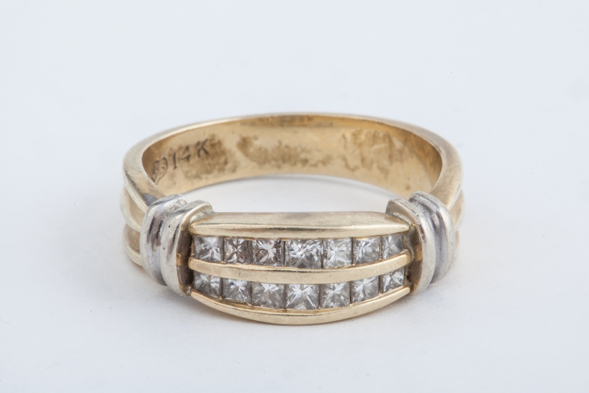 BAGUE en or 585 millièmes (14K), sertie de deux lignes de diamants princesse.