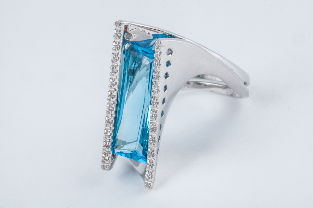 BAGUE en or gris, de forme mouvementée, ornée au centre d'une pierre de synthèse bleue (verre) rectangulaire, entre deux lignes de pierres de synthèse blanche.
