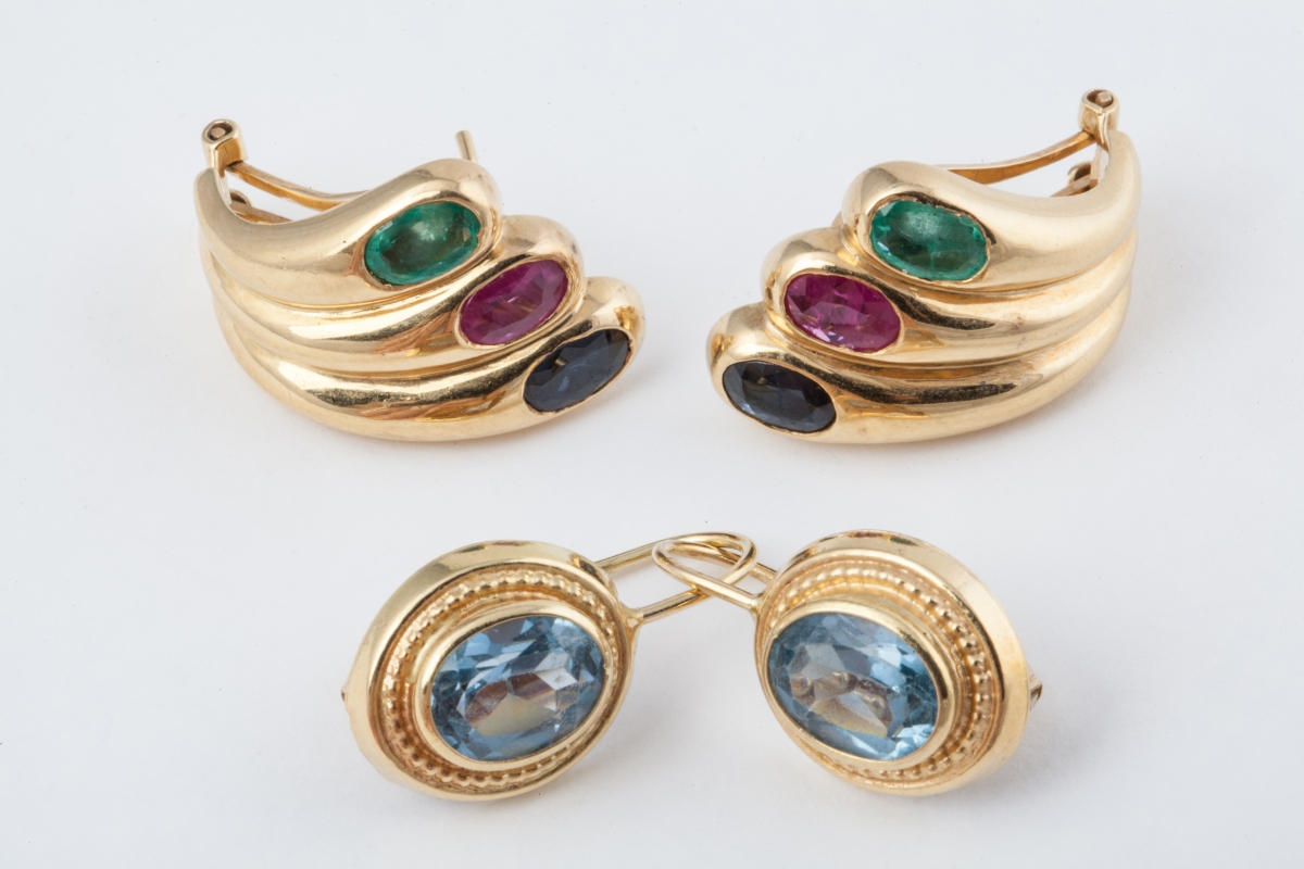 - une PAIRE DE BOUCLES D'OREILLES en or jaune composée de trois godrons ornés aux extrémités d'un saphir, d'un rubis et d'une émeraude (poids brut: 10 g).