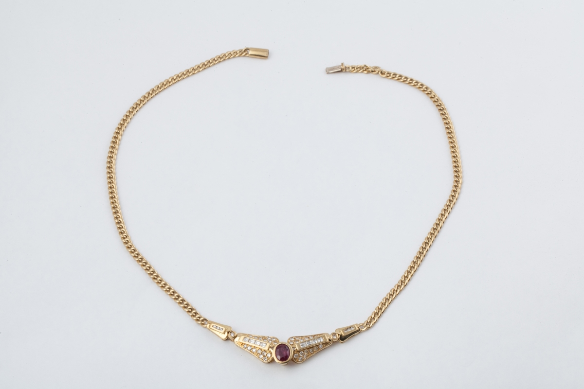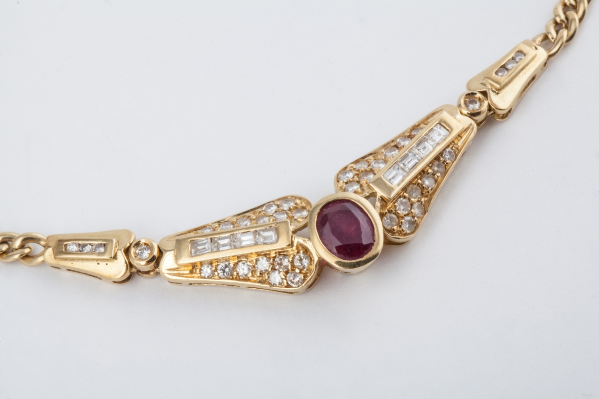 COLLIER articulé en or jaune, orné au centre d'un motif serti d'un rubis entre deux pavages de diamants.