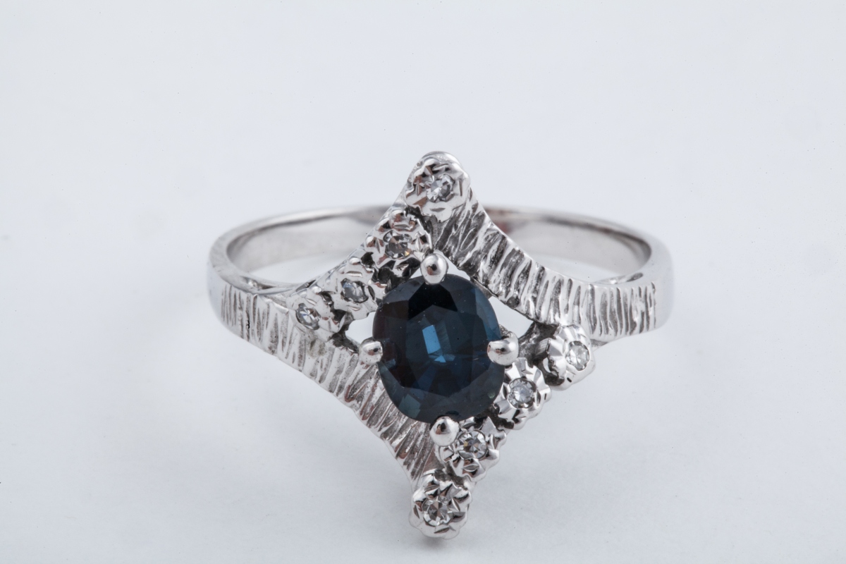 BAGUE en or jaune, sertie d'un saphir ovale dans un demi entourage de petits diamants.