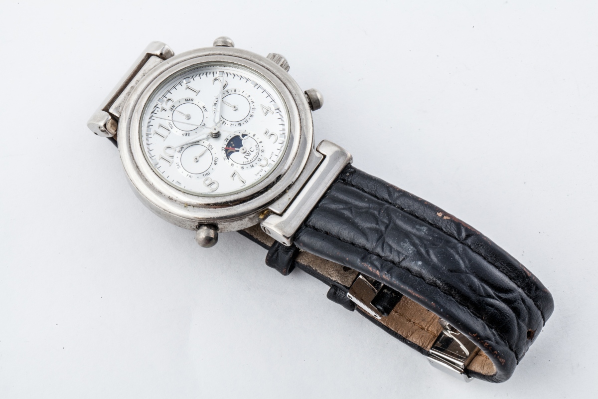MONTRE BRACELET d'homme en métal, le fond ajouré, mouvement mécanique à remontage automatique formant chronographe, jour, quantième et mois, tour de poignet en cuir, boucle déployante.