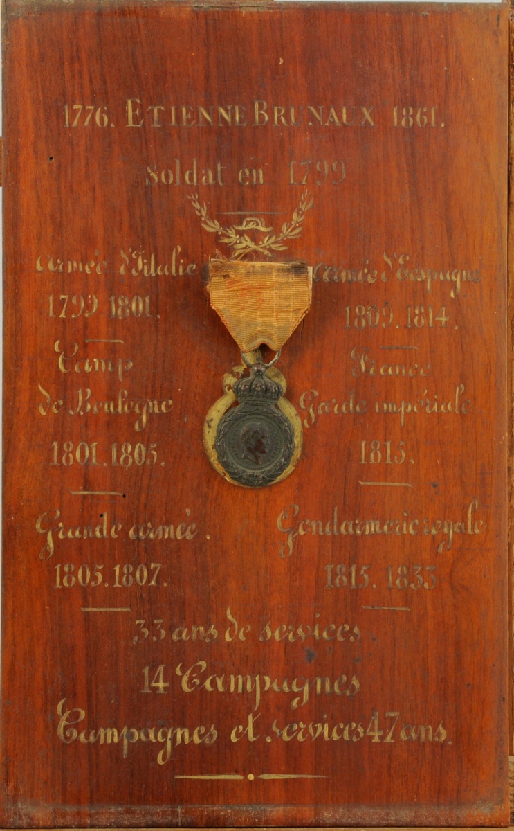 Panneau en placage d'acajou avec inscriptions peintes: " 1766 Étienne Brunaux 1861- soldat en 1799. Armée d'Italie 1799 1801 - Camp de Boulogne 1801 1805 - Grande Armée 1805 1807 - Armée d'Espagne 1809 1814 - France Garde Impériale 1815 - Gendarmerie royale 1815 1833.
