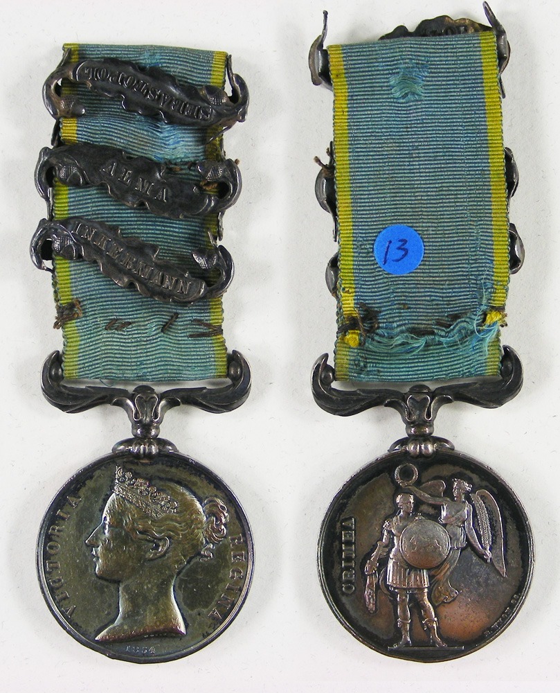 Second Empire - Grande-Bretagne, MÉDAILLE DE CRIMÉE par Wyon en argent (chocs et griffures), ruban cousu avec trois barrettes "Sebastopol", "Alma" et "Inkermann".