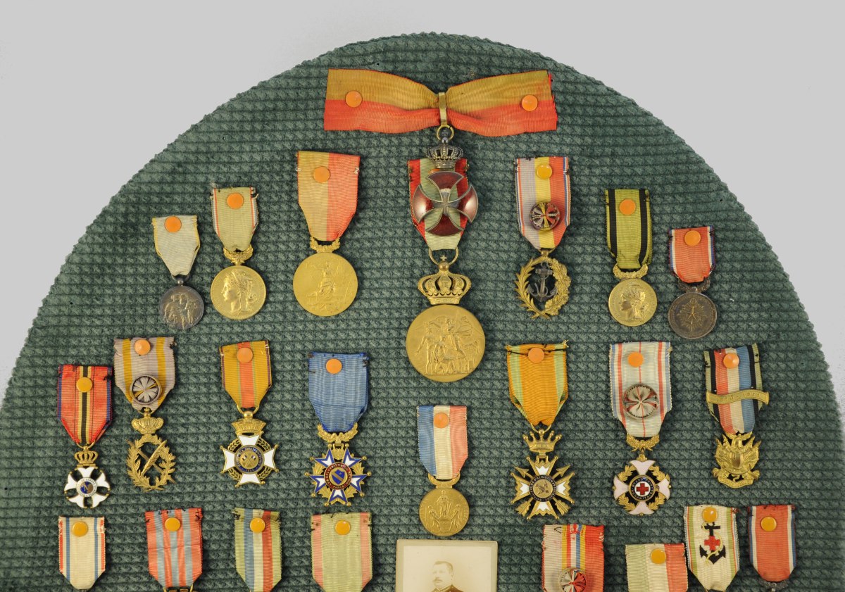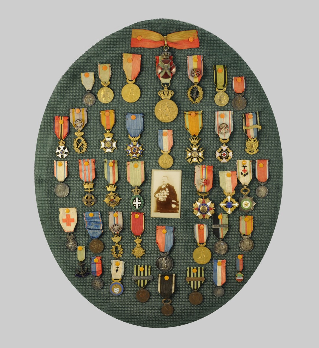 REMARQUABLE ENSEMBLE DE 40 DÉCORATIONS ET INSIGNES de sociétés privées, principalement de sauvetage, decernés à M.Honoré Henault, éminent sauveteur et Patagon. Elles sont présentées, avec sa photo, dans un important cadre ovale en stuc non ouvert (82 x 72 cm, accidents). Si la majorité des décorations sont anépigraphes et non identifiées, on distingue cependant les insignes de: l'Institut des Sauveteurs de Méditerranée de Marseille ; les Sauveteurs de Sambre et Meuse ; l'Oeuvre des Vieux Militaires ; Les chevaliers du Devoir de Paris ; deux médailles du journal Le Matin, "l'Armée - la Presse" ; les Chevaliers de Saint Sébastien et Guillaume ; le Grand Prix Humanitaire ; la société des Vétérans des Armées de Terre et de Mer "Oubliez... jamais" ; les Sauveteurs du Pas-de-Calais ; les Sauveteurs de l'Aube ; la Légion des Décorés de la Constellation du Sud du Royaume d'Araucanie et de Patagonie ; l'institut biographique italien ; une médaille de Verdun par Vernier en argent (?) à bélière articulée en forme de couronne de laurier ; SSBM ; L'Aigle ; médaille de 1870-1871 modèle Rivet type II, ruban avec barrette ; sauveteur de la Côte d'Or ; Sauveteurs des Ports ; Sauveteurs d'Ille-et-Vilaine ; deux médailles commémoratives de 1870-1871, avec barrette "Engagé Volontaire" ; médaille des secours mutuels ; Encouragement au Bien ; Association des Dames Françaises 1873. Généralement en bronze doré et argenté, elles présentent quelques petits accidents aux émaux, et possèdent leur ruban d'origine légèrement décoloré.