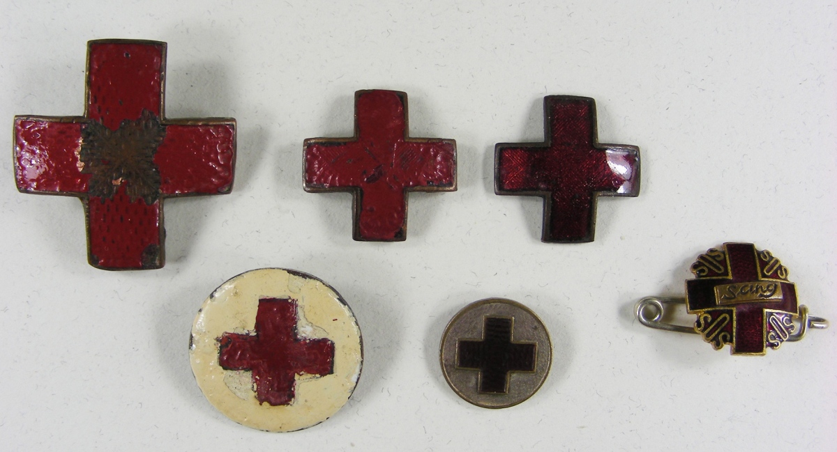 Croix-Rouge - LOT DE SIX INSIGNES de boutonnière, bronze émaillé ou peint, cinq de la Première Guerre Mondiale.
