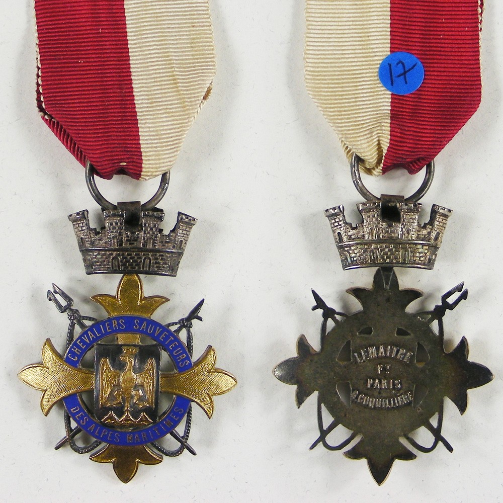 MÉDAILLE de membre de la Société des Chevaliers Sauveteurs des Alpes-Maritimes,en métal argenté et doré, signé Lemaître, ruban.