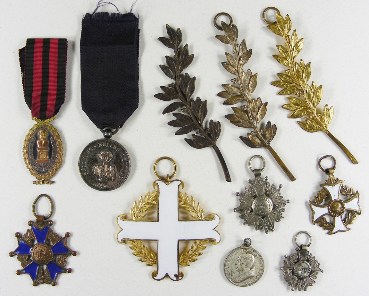 LOT DE ONZE PIÈCES: une médaille de membre de l'Académie poétique de France fondée par Antonin Martin, métal argenté et doré, ruban ; trois palmes de prix en bronze patiné, argenté et doré, la base de la branche signée A.M. (Antonin Martin?), suspension par anneau (l'un brisé) ; une médaille de membre fondateur de la revue "Sciences * Belles-Lettres" fondée par Evariste Carrance, métal argenté, ruban ; quatre croix de mérite scolaire,deux émaillés, métal doré ou argenté ; une grande croix ancrée en bronze doré et émaillé blanc, uniface, sans ruban ; une petite médaille au profil de Pie XII pour l'année jubilaire 1950, métal argenté.