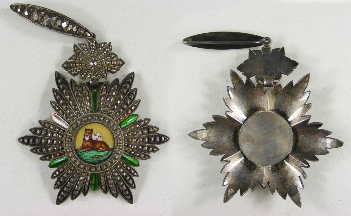 Perse - ORDRE DU LION ET DU SOLEIL, ÉTOILE DE IIIe CLASSE (commandeur), étoile à six rayons en argent travaillés en pointes de diamant, anglés de rais émaillés vert (un manque), au centre, le lion couché est ceint d'un simple cerclage diamanté, bélière en forme de gloire, sans cravate.