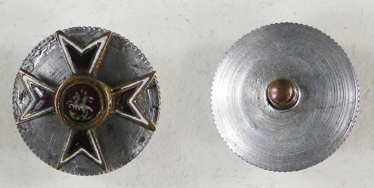 Russie - INSIGNE de l'école militaire de Chughuev, réduction de boutonnière en métal doré et émaillé (cheveux), fixation par vis et écrou, fabrication d'émigration.
