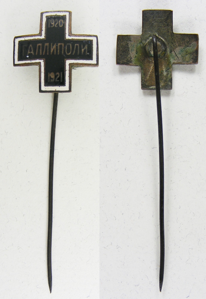 Russie - Guerre Civile, CROIX DE GALLIPOLI, réduction de boutonnière en métal argenté et émaillé, fixation par épingle fixe, fabrication d'émigration.