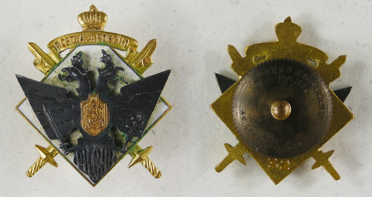 Russie - Émigration, INSIGNE de l'Union Amicale des Anciens Combattants Russes "RNSUV", réduction de boutonnière en métal doré, argenté et émaillé, le revers porte gravé la matricule "32", fixation par vis et écrou signé Arthus Bertrand.