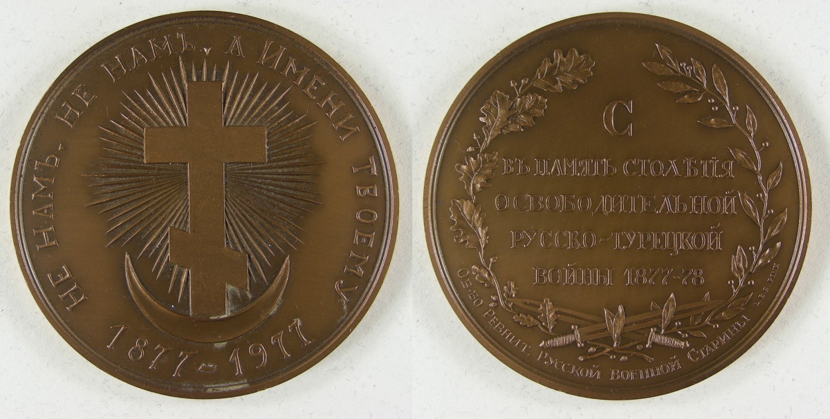Russie - Émigration, 1978, MÉDAILLE DE TABLE commémorative du centenaire de la guerre Russo-Turque de 1877-1878, frappe en bronze clair de la Monnaie de Paris. Diam. 59 mm.