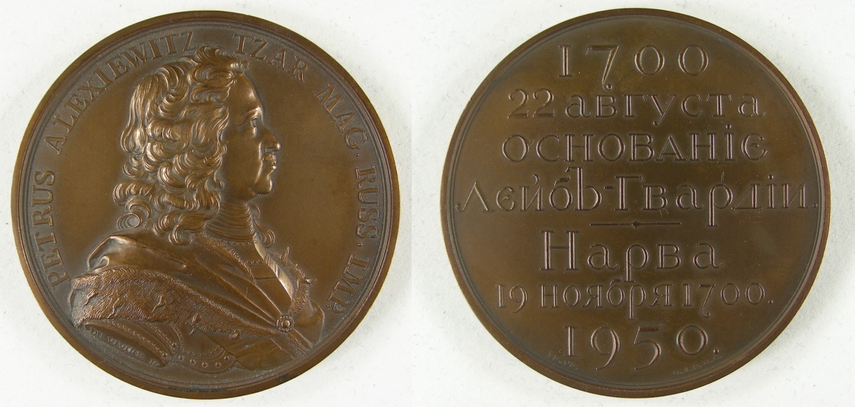 RUSSIE - Émigration, 1950, MÉDAILLE DE TABLE commémorative du 250e anniversaire de la fondation de la Garde Impériale le 22 août 1700 et de sa participation à la bataille de Narva le 19 novembre suivant, l'avers reprend le profil de Pierre le Grand par Duvivier, frappe en bronze de la Monnaie de Paris.