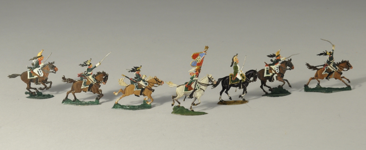 SOLDATS de PLOMB peints à la main. 16 pièces. Dragons à uniforme vert et rouge. Un porte drapeau.