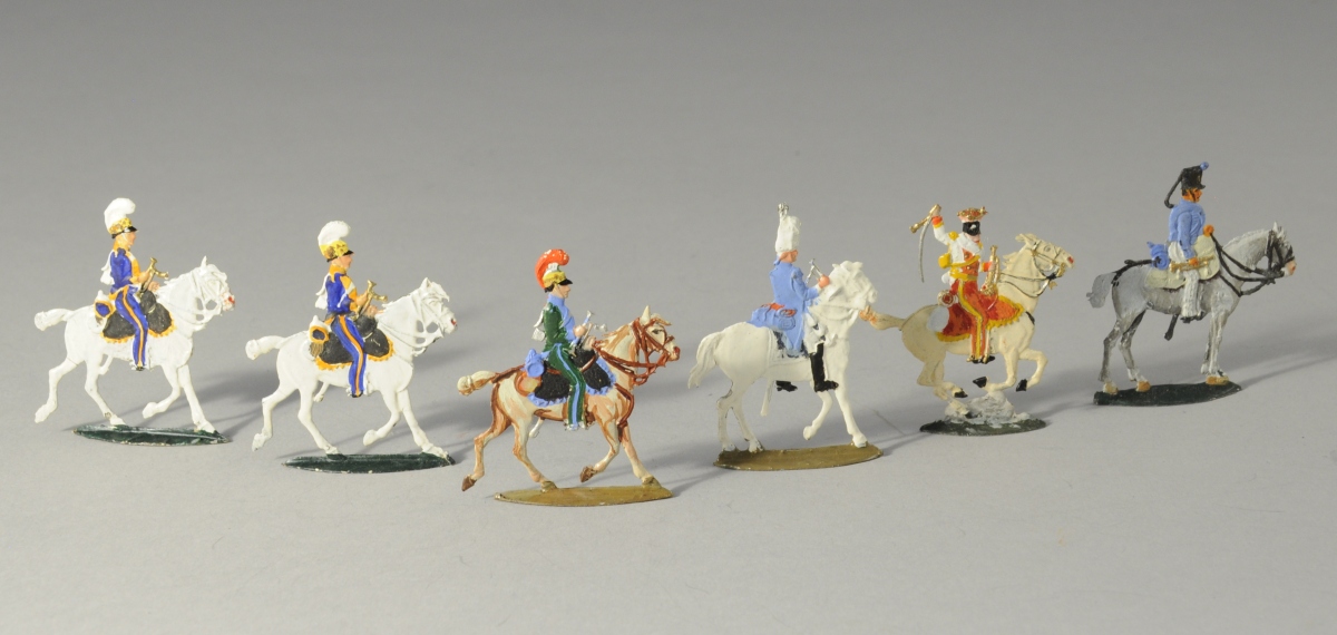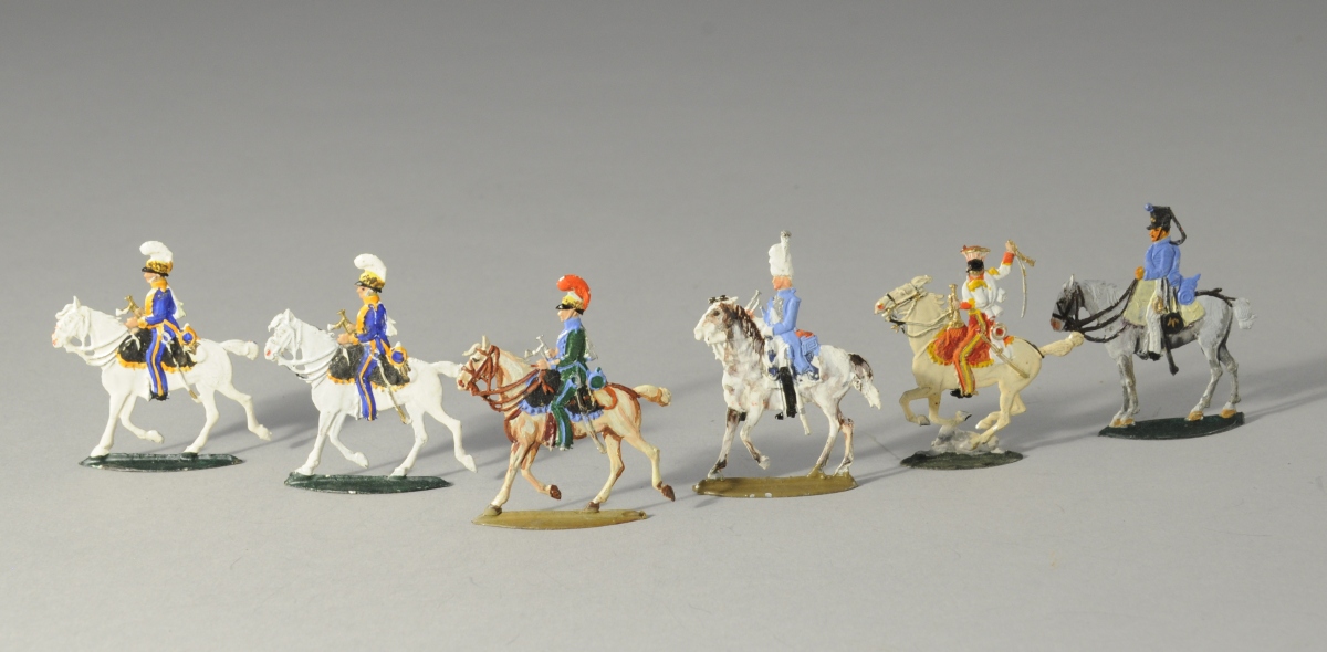 SOLDATS de PLOMB peints à la main. 14 pièces. Officiers à cheval et cavaliers de divers corps d'armée et pays.