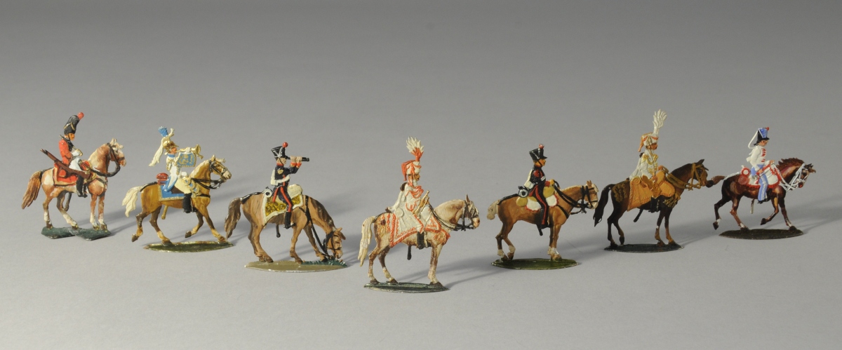 SOLDATS de PLOMB peints à la main. 17 pièces. Officiers à cheval et cavaliers de divers corps d'armée et pays.