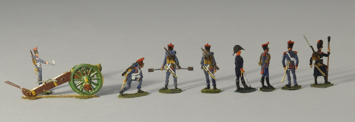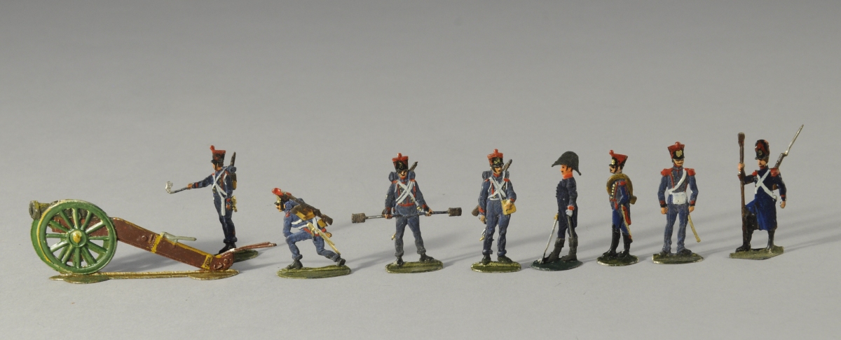 SOLDATS de PLOMB peints à la main. 39 pièces. 18 canons et 21 artilleurs en action.