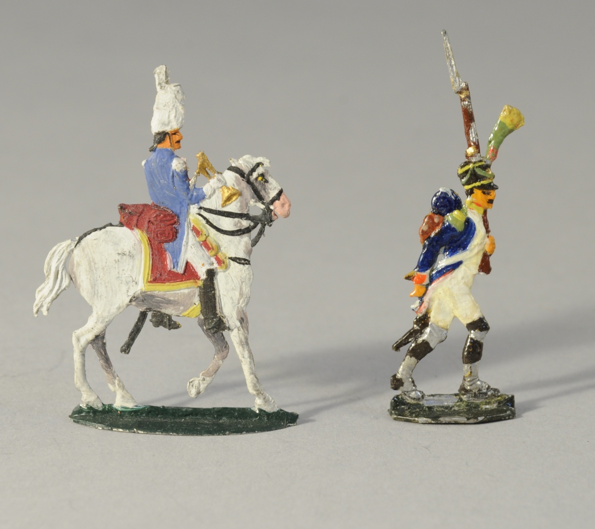 SOLDATS de PLOMB peints à la main. 19 pièces. Fantassins à uniforme vert et jaune (un cassé).