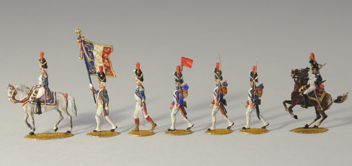 SOLDATS de PLOMB peints à la main. 39 pièces dont deux portes drapeau et 2 officiers et 2 sous officiers. GROGNARDS. Uniforme blanc et bleu à plumet rouge.