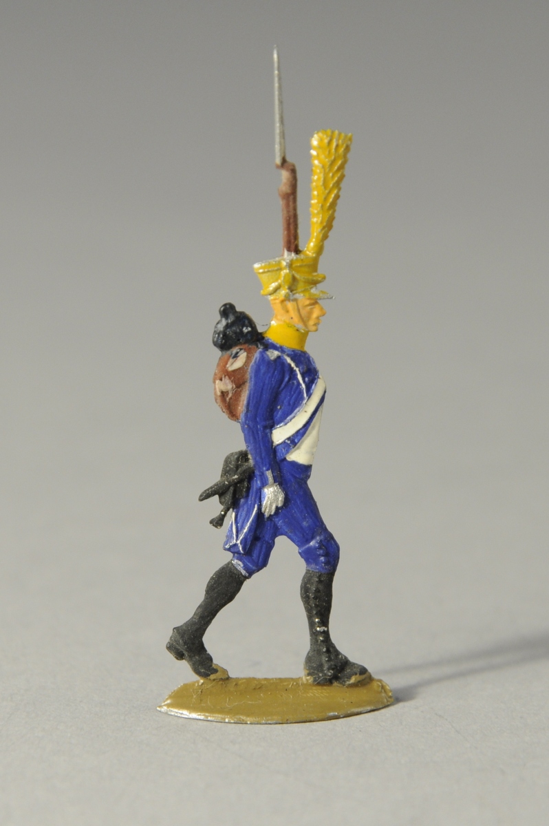 SOLDATS de PLOMB peints à la main. 19 pièces. Fanatassins à uniforme bleu et plumet jaune.