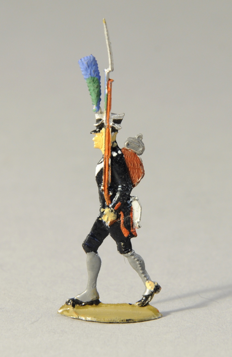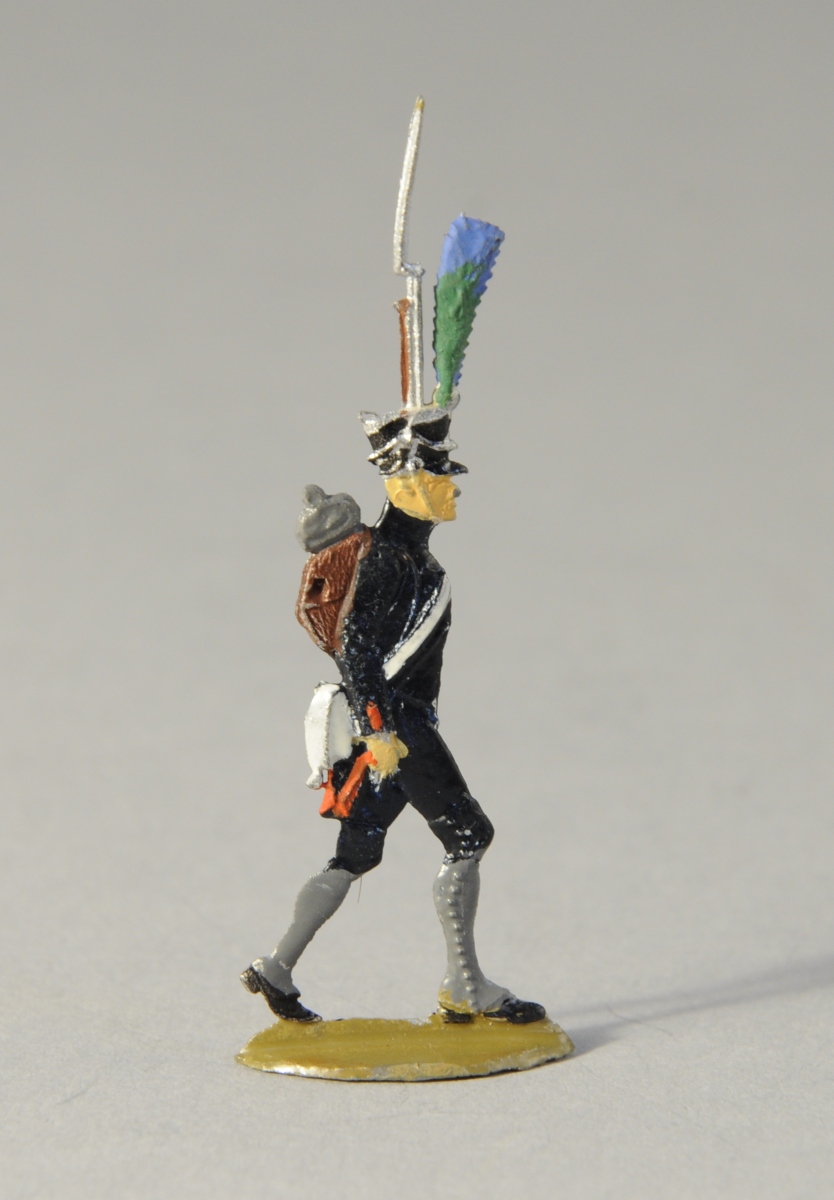 SOLDATS de PLOMB peints à la main. 22 pièces. Fantassin à uniforme noir et plumet bleu et vert.