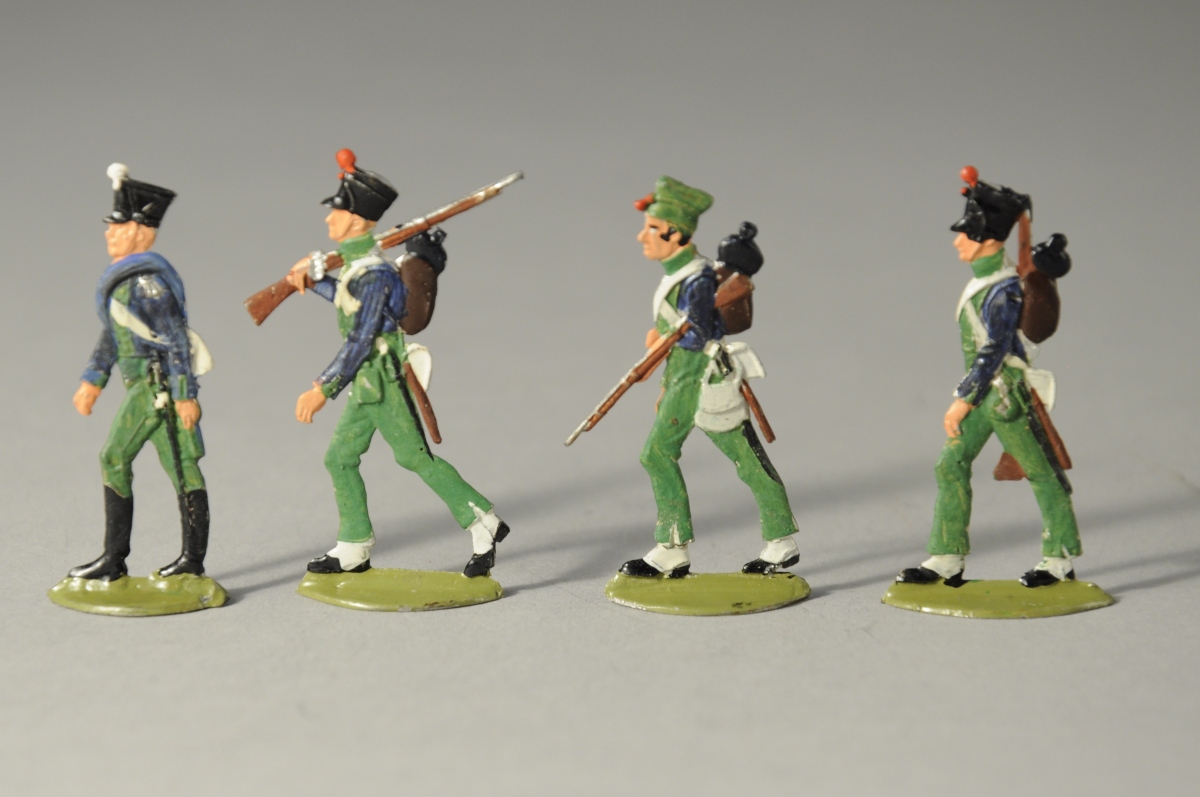 SOLDATS de PLOMB peints à la main. 13 pièces. Fantassins à uniforme vert clair.