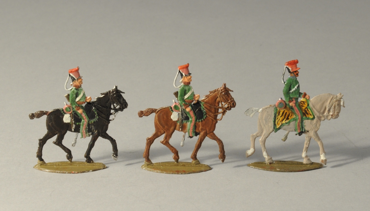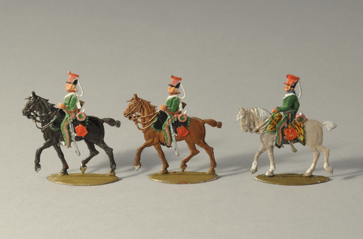 SOLDATS de PLOMB peints à la main. 28 pièces. Cavaliers à uniforme vert et rouge, dont un officier.