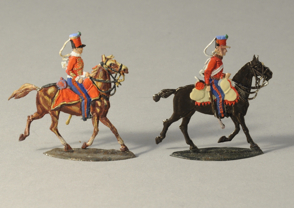 SOLDATS de PLOMB peints à la main. 18 pièces. Cavaliers à uniforme bleu et rouge, dont un officier.