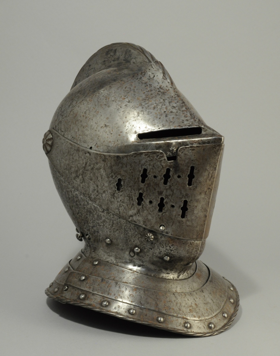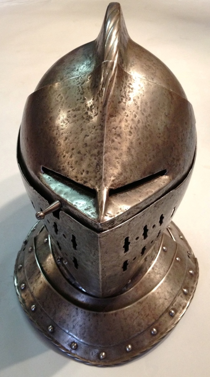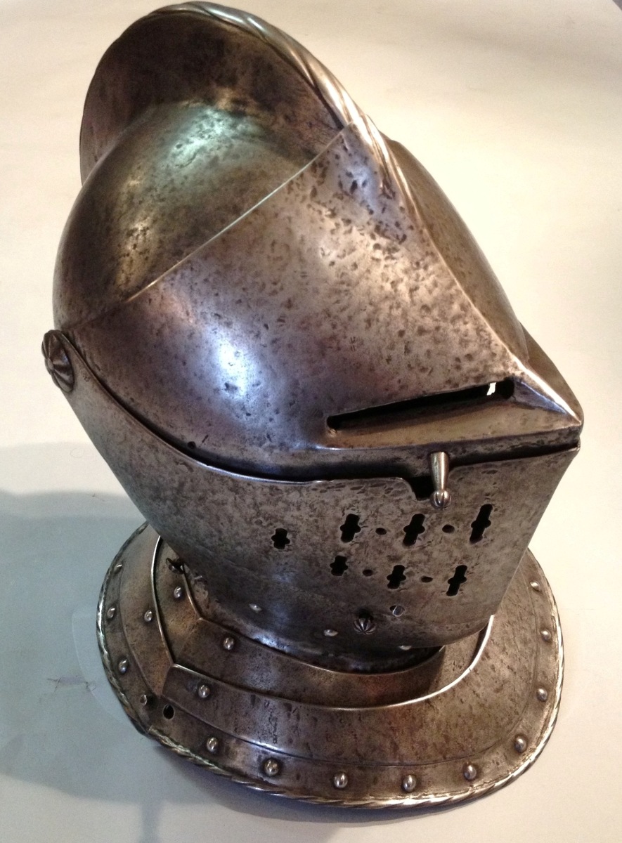 ARMET de style XVIe en fer forgé . Timbre surmonté d'une crête striée, avec porte plumet à la base sur l'arrière. Visière à deux fentes à division centrale. Mézail ajouré à rosaces godronnées. Mentonière en forme et gorgerin bordé de rivets ronds, bord arrondi et strié.