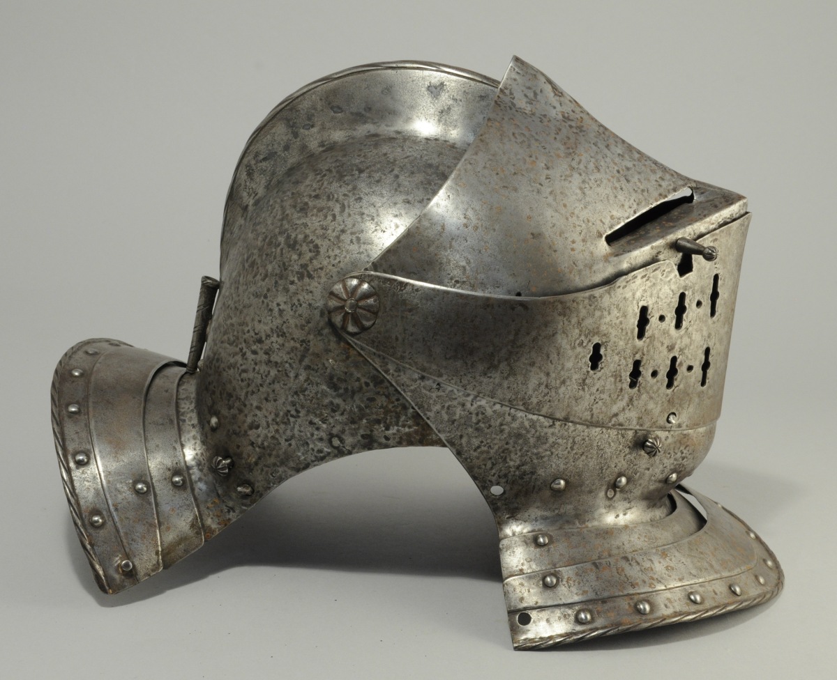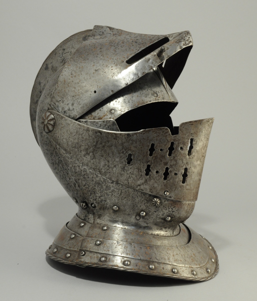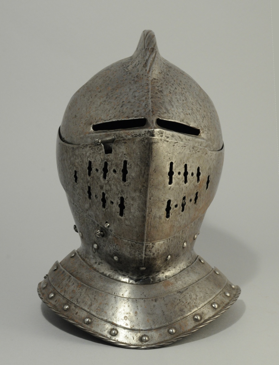 ARMET de style XVIe en fer forgé . Timbre surmonté d'une crête striée, avec porte plumet à la base sur l'arrière. Visière à deux fentes à division centrale. Mézail ajouré à rosaces godronnées. Mentonière en forme et gorgerin bordé de rivets ronds, bord arrondi et strié.