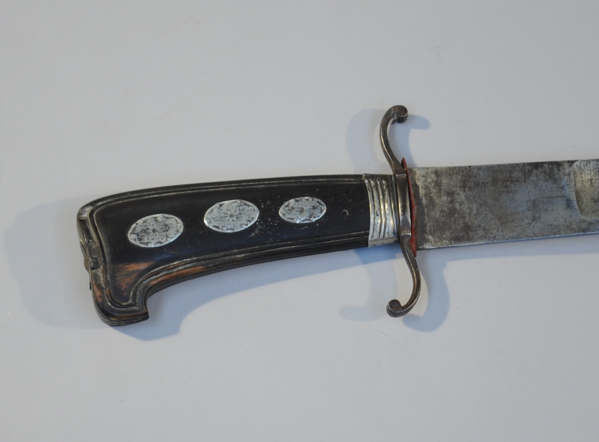 FORT COUTEAU DE VÉNERIE. Poignée en ébène à trois boutons de rivure ornés d'un fleuron et bague en argent poinçonné. Lame légèrement courbe à dos plat, contre-tranchant et pans creux (piqûres, accidents). Garde en fer à deux branches.