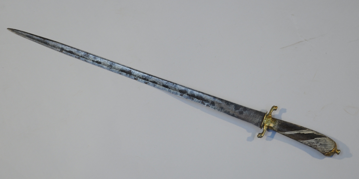 COUTEAU DE VÉNERIE. Poignée en bois strié. Monture en laiton, garde à deux quillons, calotte à bouton et tête de lion. Lame à dos plat et pans creux (forte oxydation, accidents).