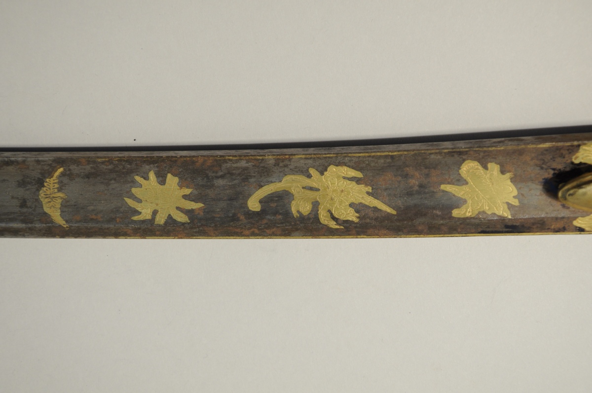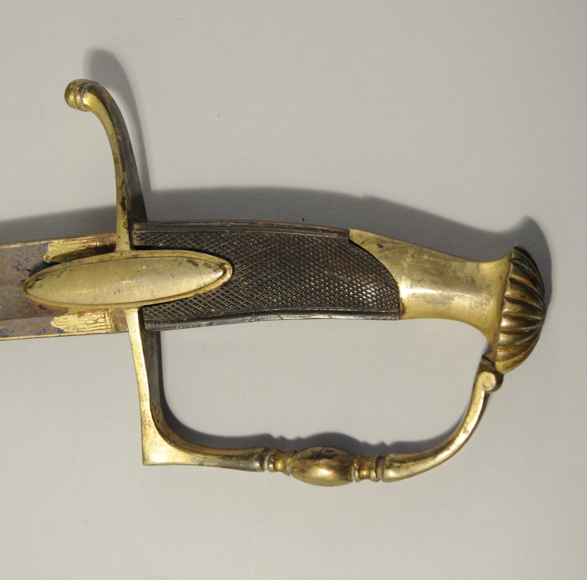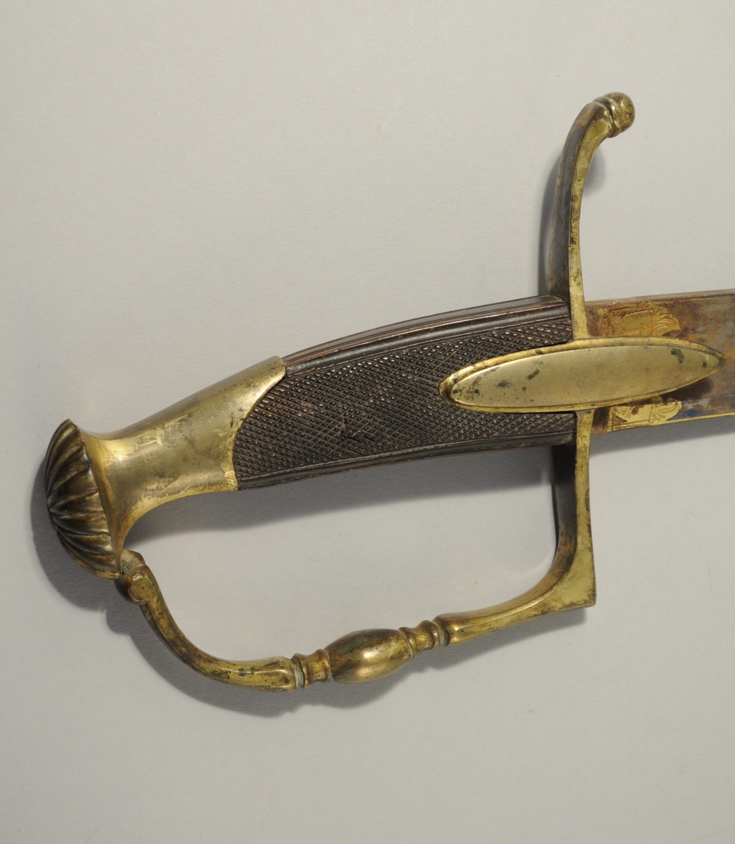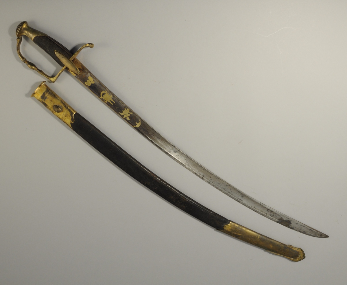 SABRE D'OFFICIER D'INFANTERIE type1800. Poignée en ébène à quadrillage en losange (accidents). Monture en laiton à une branche à olive centrale flanquée de moulures. Calotte à côtes de melon. Garde à une branche et deux oreillons en navette. Lame courbe à dos plat, contre-tranchant et pans creux, bleuïe et gravée au tiers de motifs floraux et trophées dorés. Fourreau en cuir noir à deux garnitures en laiton découpé.
