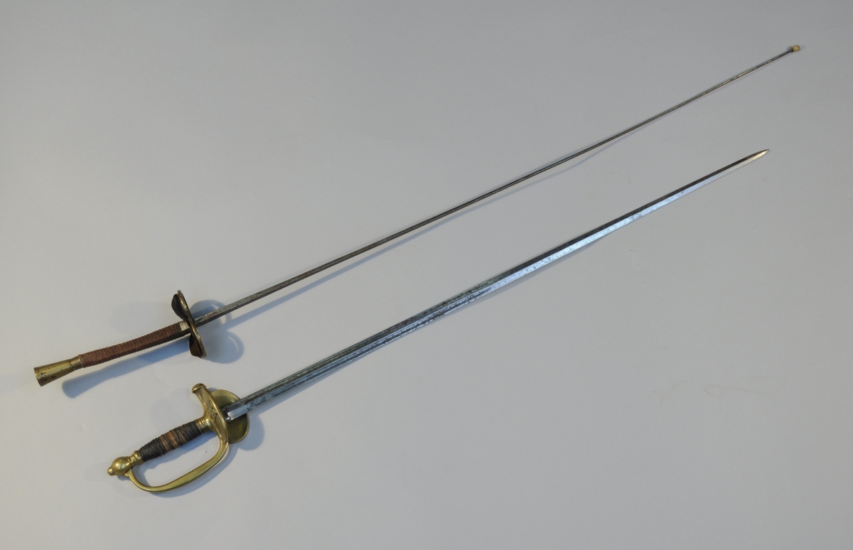 ÉPÉE D'OFFICIER SUBALTERNE de toutes armes à clavier, modèle 1817, modifié 1821. Monture en laiton. Garde à une branche. Lame droite. Plateau fixe au Coq, la patte droite sur globe et la gauche sur bâton de foudre. Plateau intérieur amovible gravé "A. Duterme". Travail de la manufacture de Klingenthal.