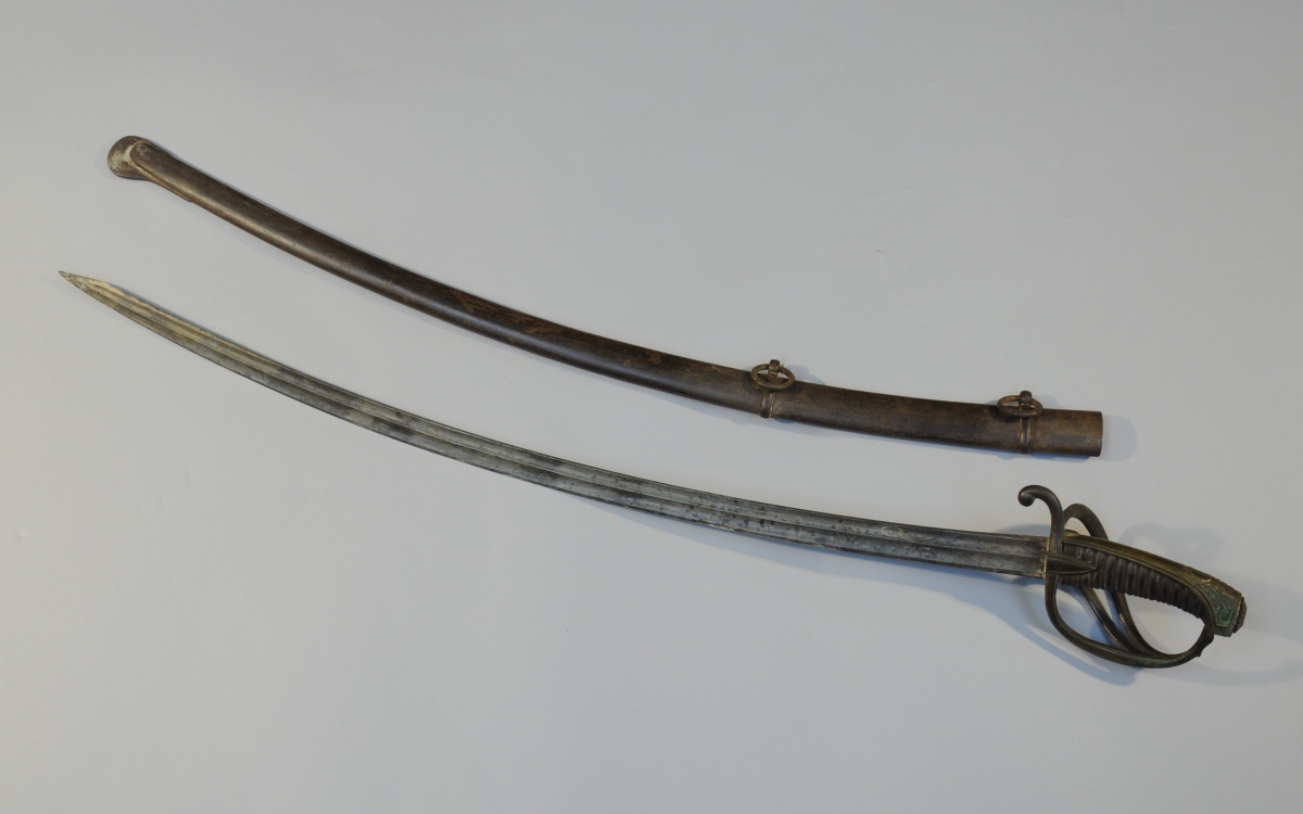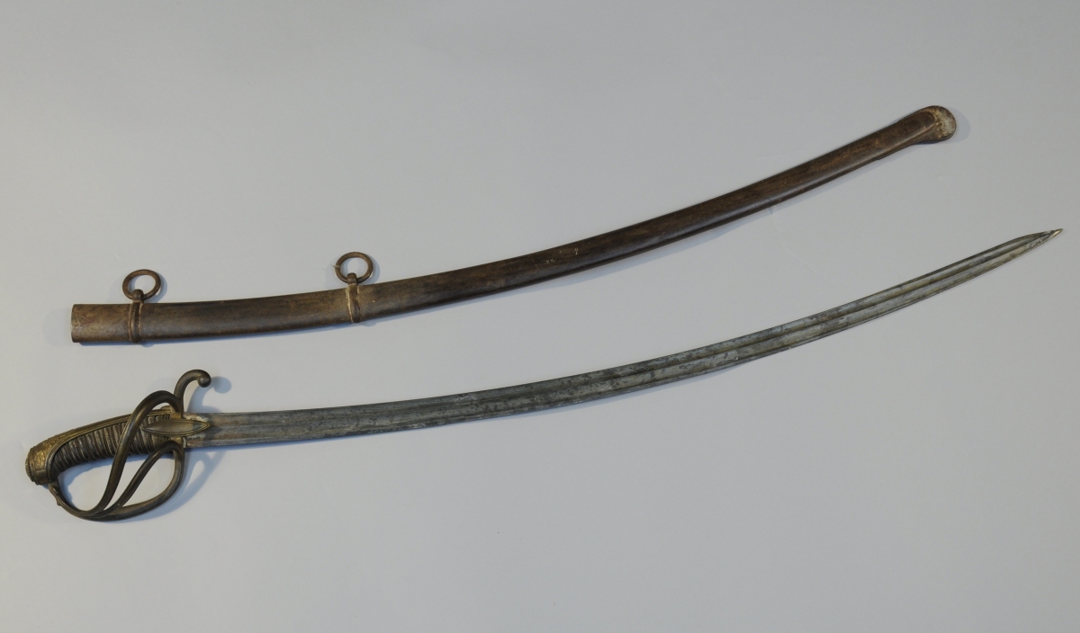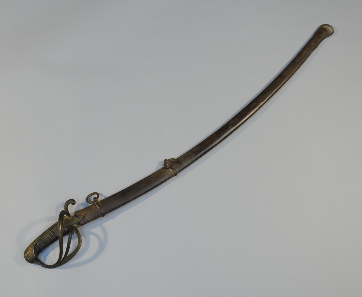 SABRE D'OFFICIER DE CAVALERIE LÉGÈRE. Monture en laiton ciselée de feuillages et monogrammée "PB" dans un cartouche. Calotte à fleuron, garde à trois branches et deux oreillons en navette. Poignée recouvert de basane avec filigrane. Lame courbe à dos plat et pans creux, gravé au tiers de rinceaux feuillagés et trophées d'armes. Fourreau en tôle de fer à deux bracelets de bélière.