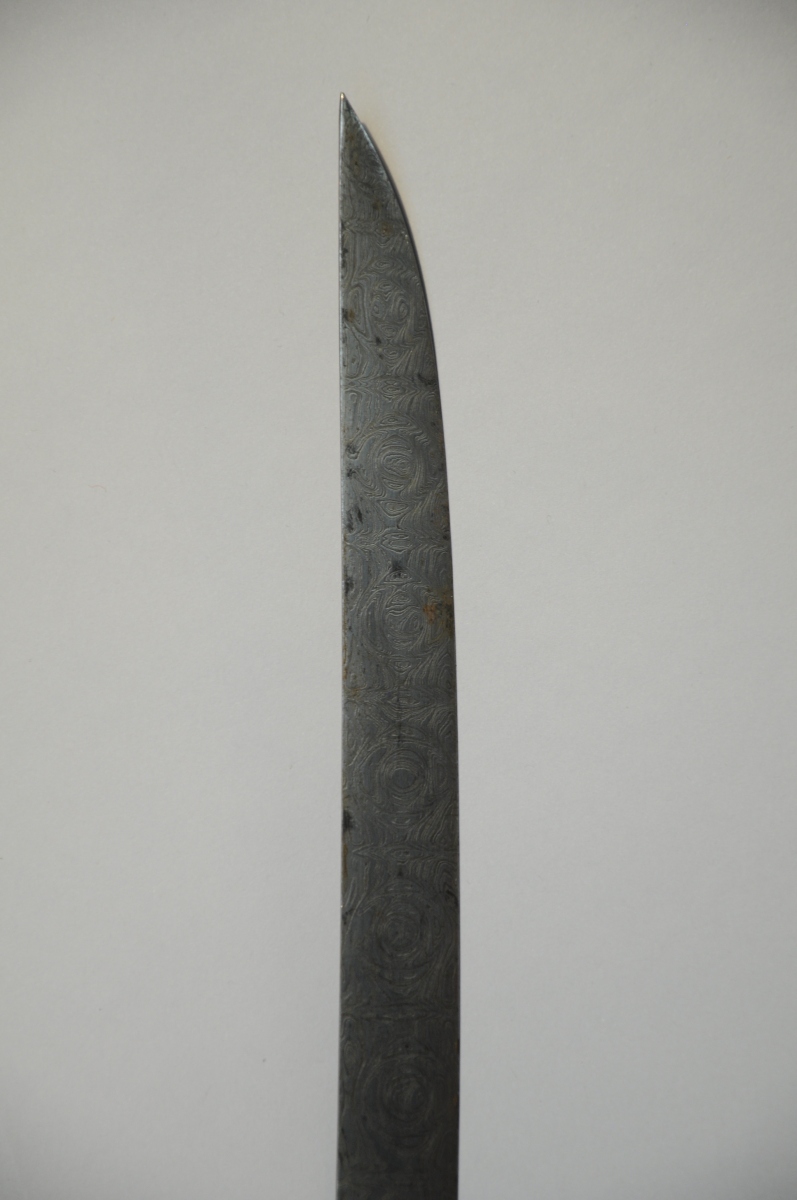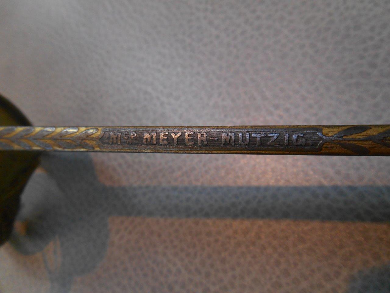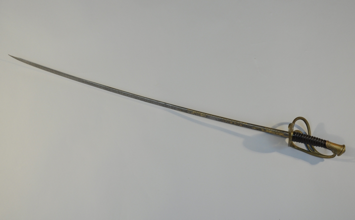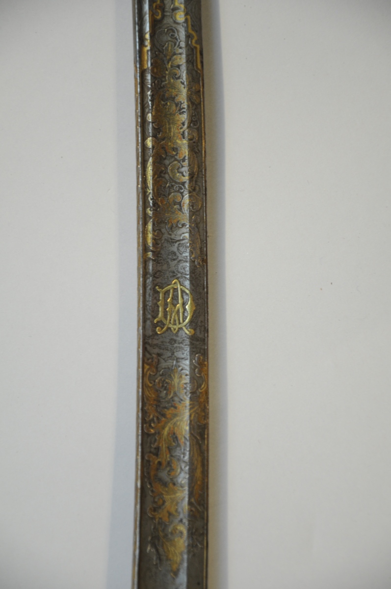 SABRE D'OFFICIER DE CAVALERIE LÉGÈRE, modèle 1822. Poignée en corne (manque le filigrane), monture et garde à trois branches en laiton ciselées de feuillages. Belle lame courbe à dos plat, pan creux et gorge latérale en acier damassé ornée au tiers de trophées d'armes et feuillages stylisés dorés. Marquée "Mce Meyer-Mutzig". Monogrammée en lettres d'or "AD". La garde au poinçon de Backes et Delecour, fourbisseur à Paris.