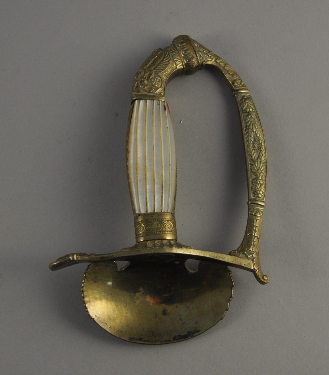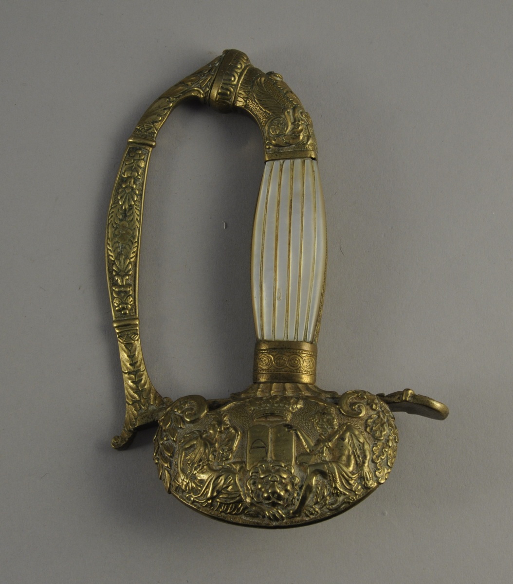 POIGNÉE D'ÉPÉE D'OFFICIER, en laiton richement ciselé d'acanthe stylisées, palmettes, enroulements et fleurons. Garde à clavier centré des Tables de la Loi timbrées d'une couronne fermée, posant sur une depouille de lion et tenues par Hercule et une autre divinité. Fusée à plaquettes de nacre cannelées.