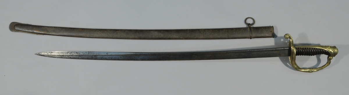 SABRE de chasseur de Vincennes, modèle 1838. Poignée en corne (manque filigrane). Monture en laiton ciselé, garde à une branche et coquille ajourée. Lame cintrée à dos arrondi avec restes de marquages. Fourreau en tôle de fer à un bracelet.