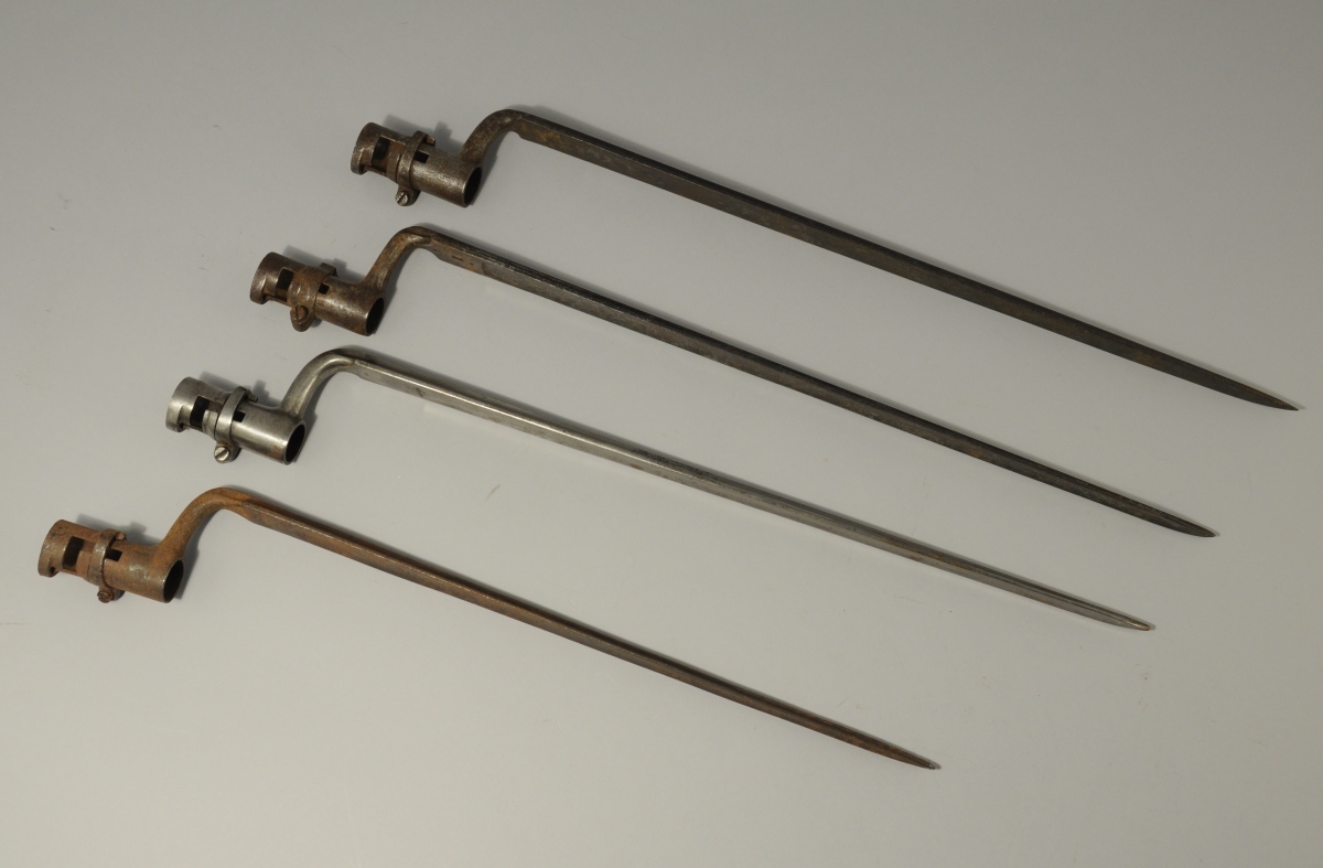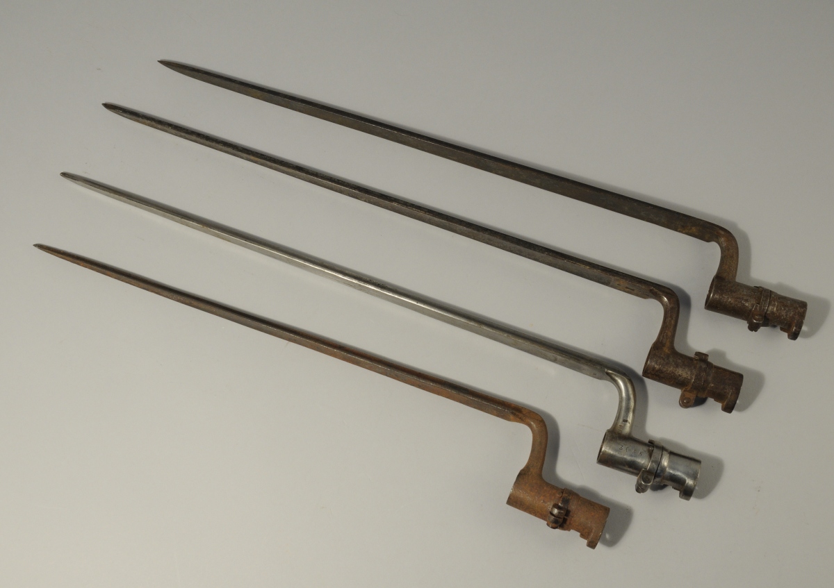 QUATRE BAÏONNETTES à douille, modèle 1847. Douille ronde. Lame triangulaire avec marquages.