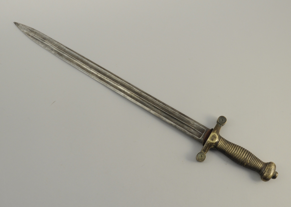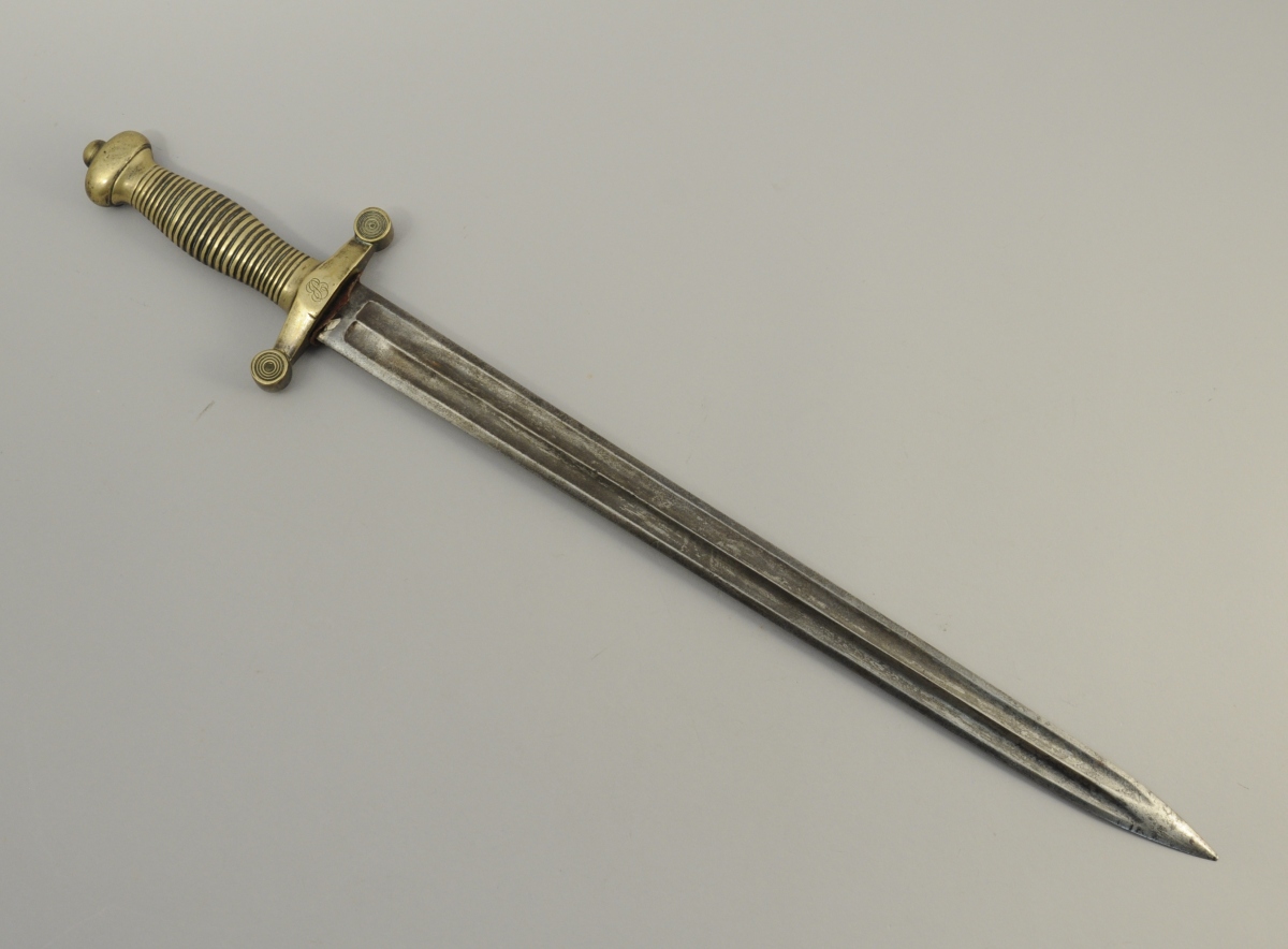 GLAIVE DE POMPIER ou de cantinière, modèle 1855. Monture en bronze monogrammée "EB", poignée à 26 cannelures, croisière droite à quillons à rouelles. Lame à double gouttière.