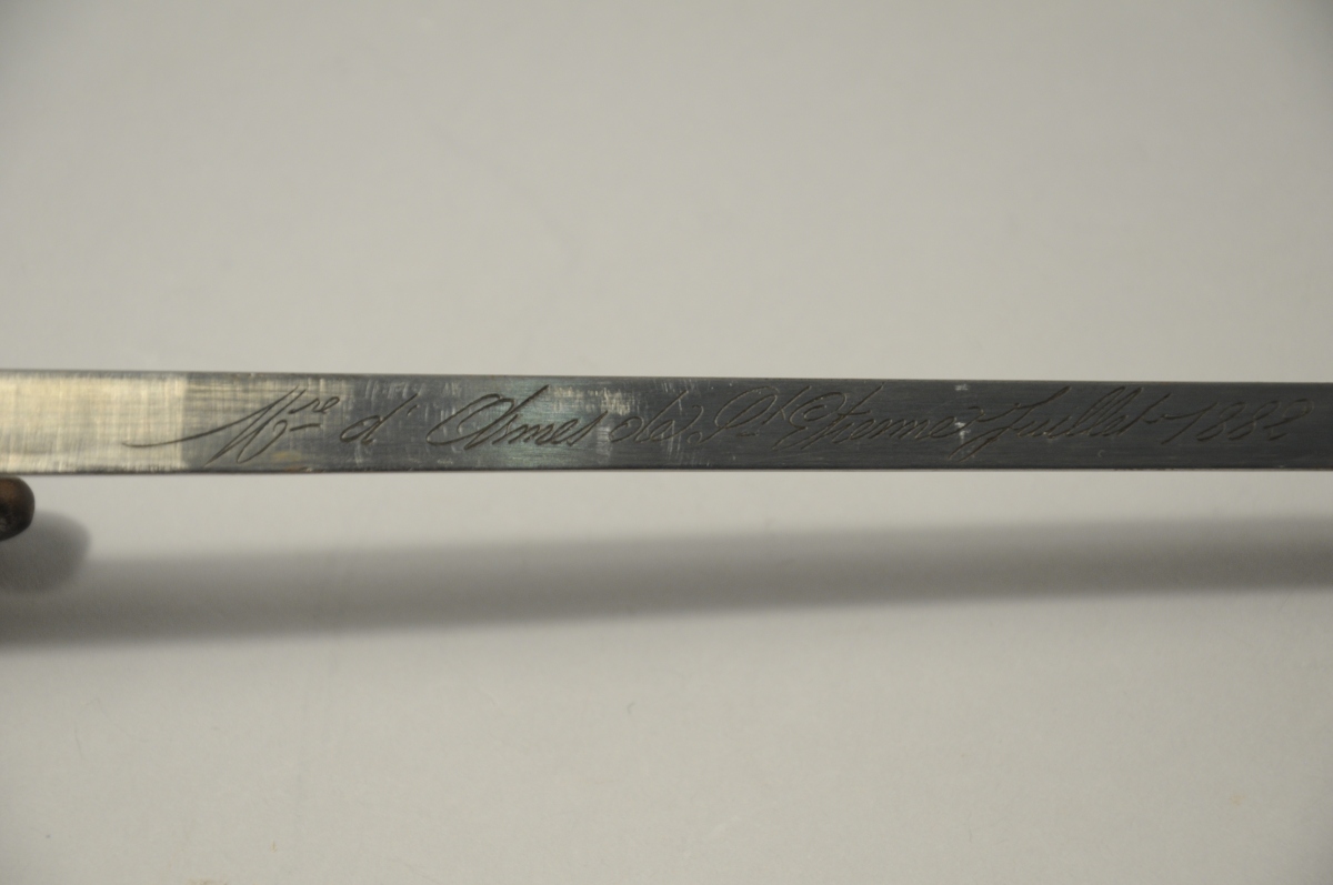 DEUX BAÏONNETTES GRAS, modèle 1874. Poignée en laiton et plaquettes de bois. Croisière en fer avec numéro de matricule et poinçons pour l'une. L'une marquée "Mre d'Armes de St Etienne Juillet 1882" avec son fourreau, l'autre avec fourreau.