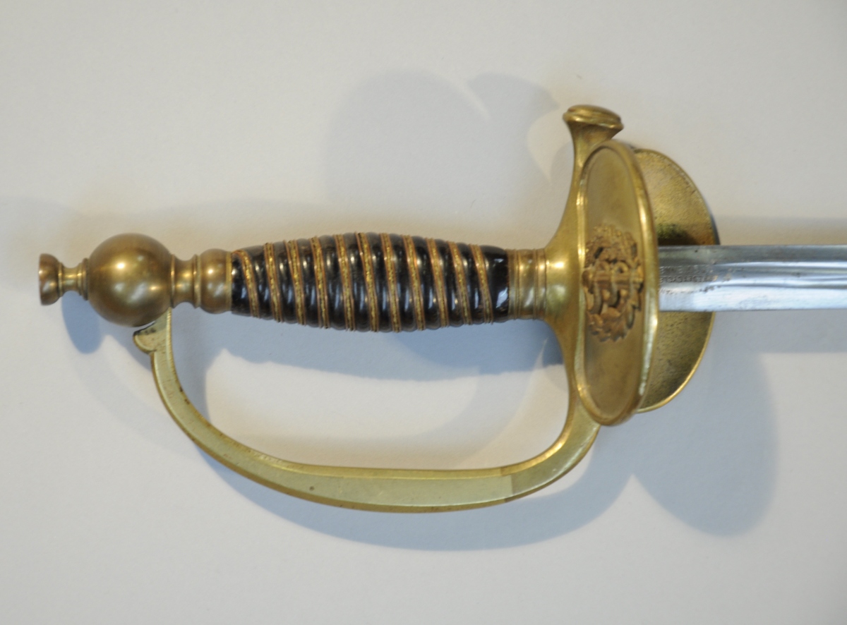 ÉPÉE D'OFFICIER DU SERVICE DE SANTÉ, modèle 1887. Fusée en bois avec filigrane. Monture en laiton. Garde à une branche. Plateau fixe au caducée. Lame droite à double gouttière au tiers signée "Manufacture française / Armes et Cycles / St Etienne". Fourreau en tôle de fer à un anneau (oxydé).
