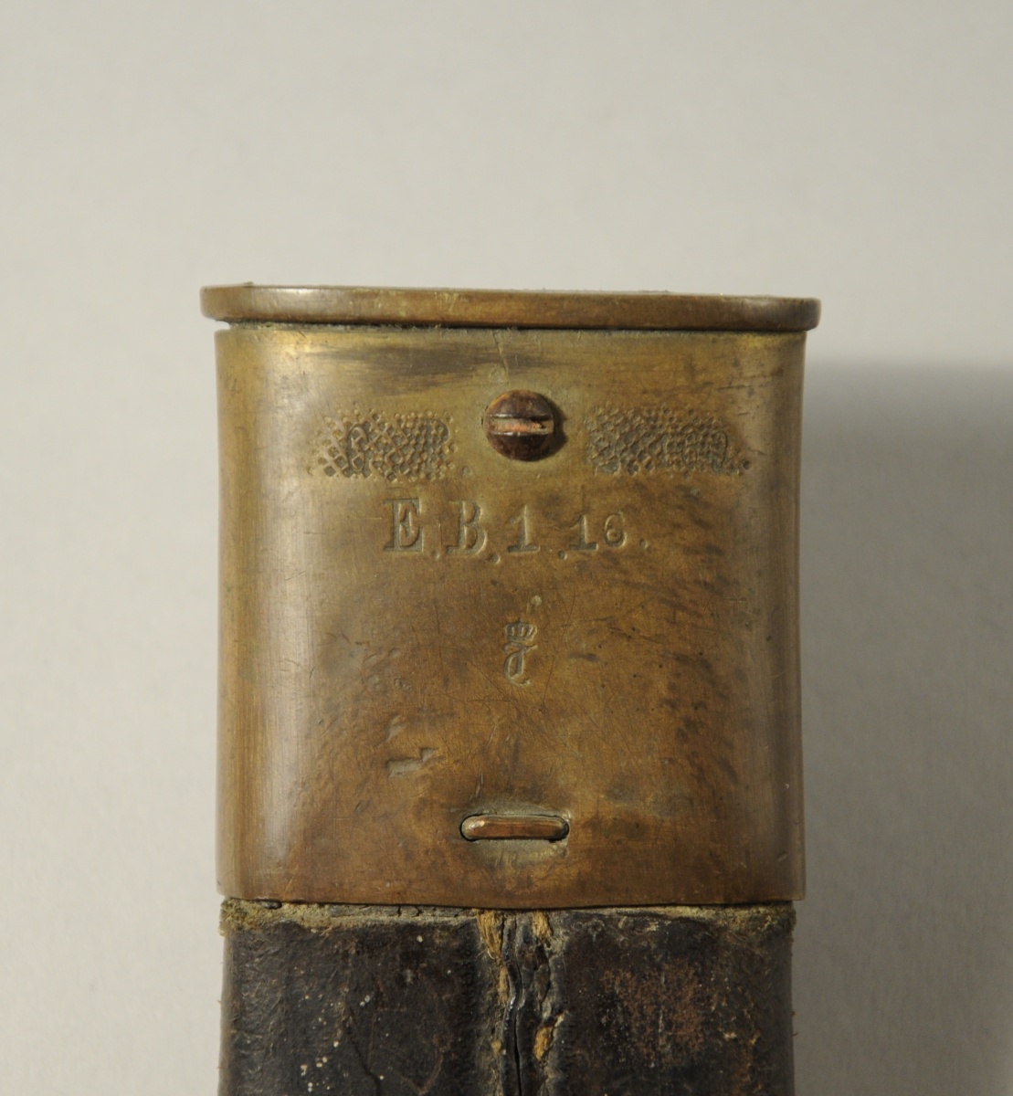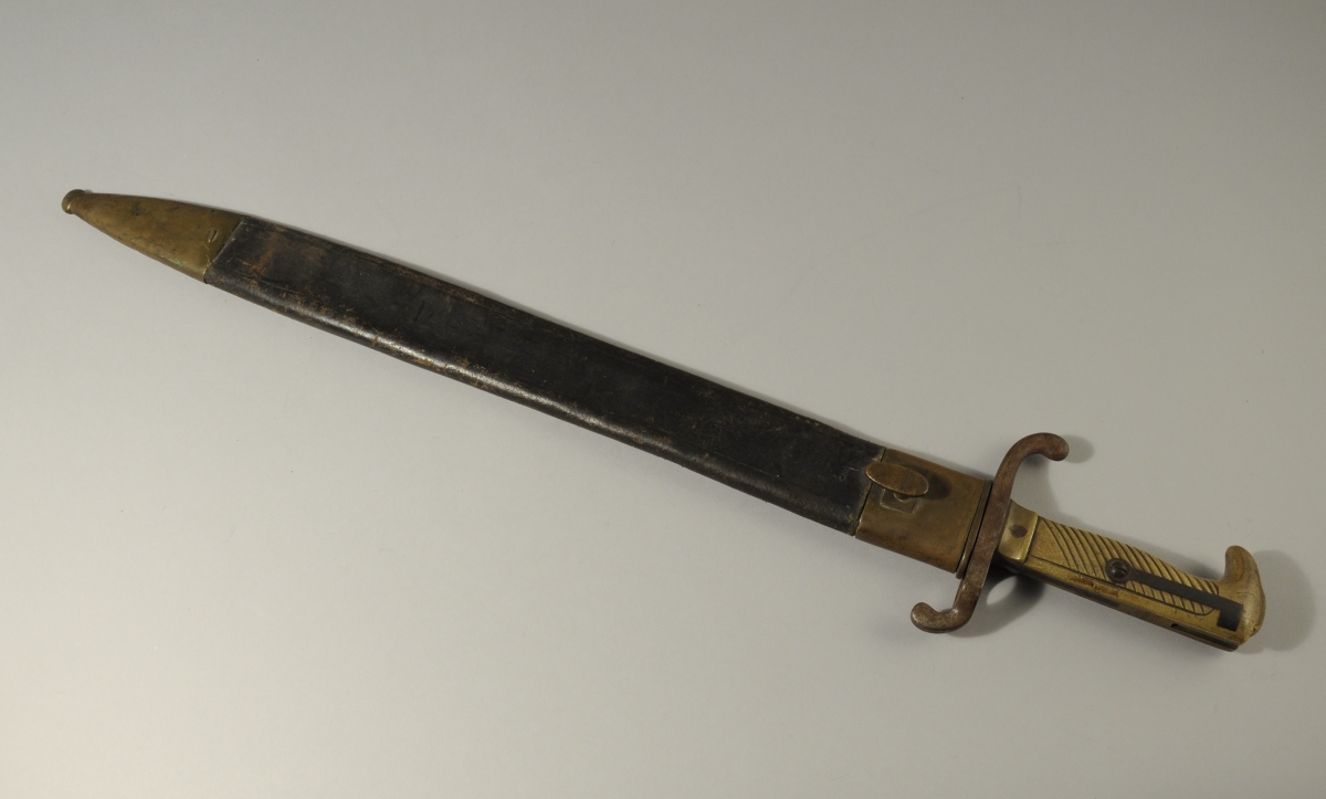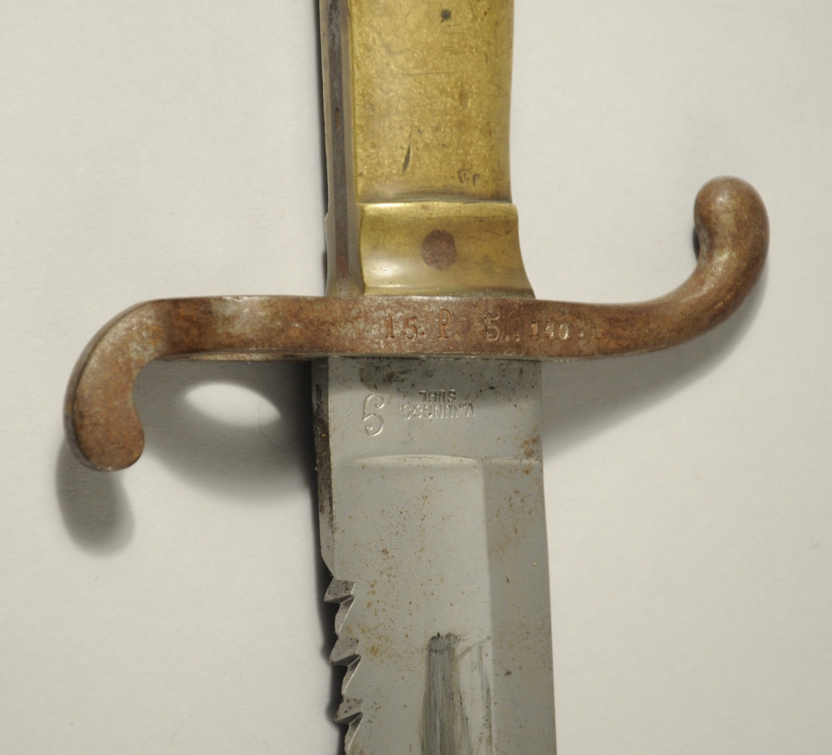 PRUSSE. BAÏONNETTE DE PIONNIER, modèle 1865-1871. Lame à 75 dents de scie poinçonnée, marquée "V.JUNG & S. / SUHL / G" et datée 70. Croisière en fer à quillons inversés numérotée "15.P. 5. 140". Poignée en laiton striée. Fourreau en cuir à deux garnitures de laiton. Chappe marquée "E.B.1.16" et poinçonnée.