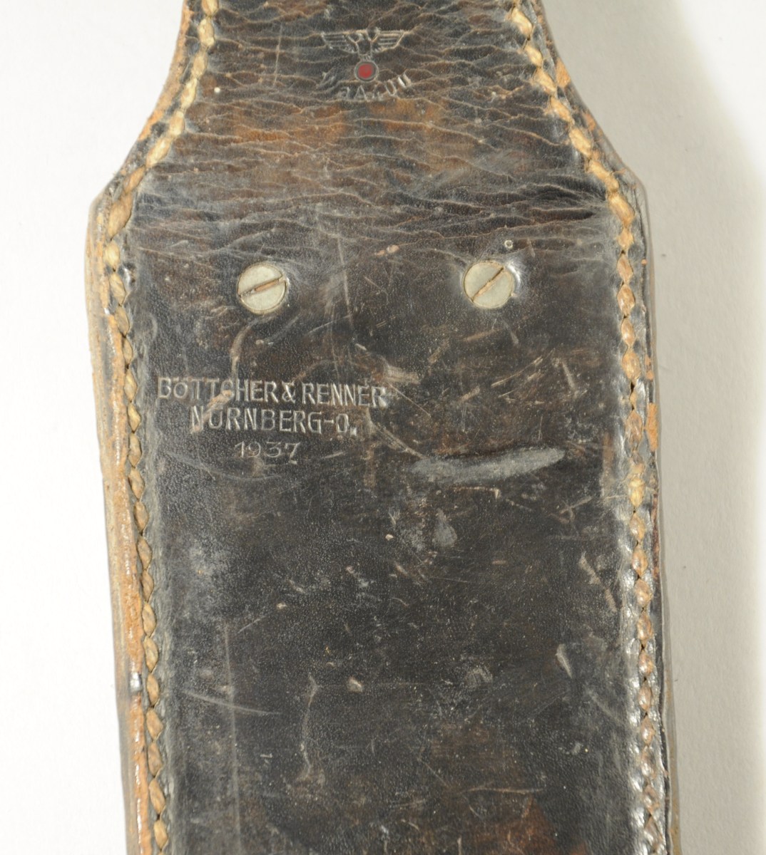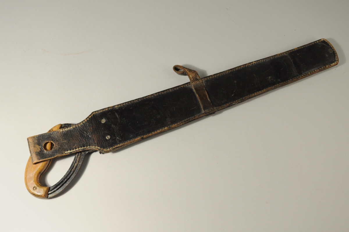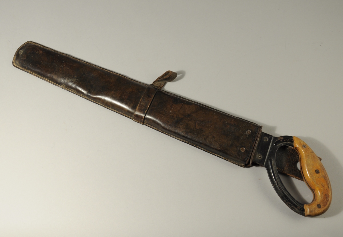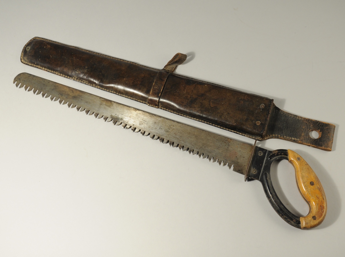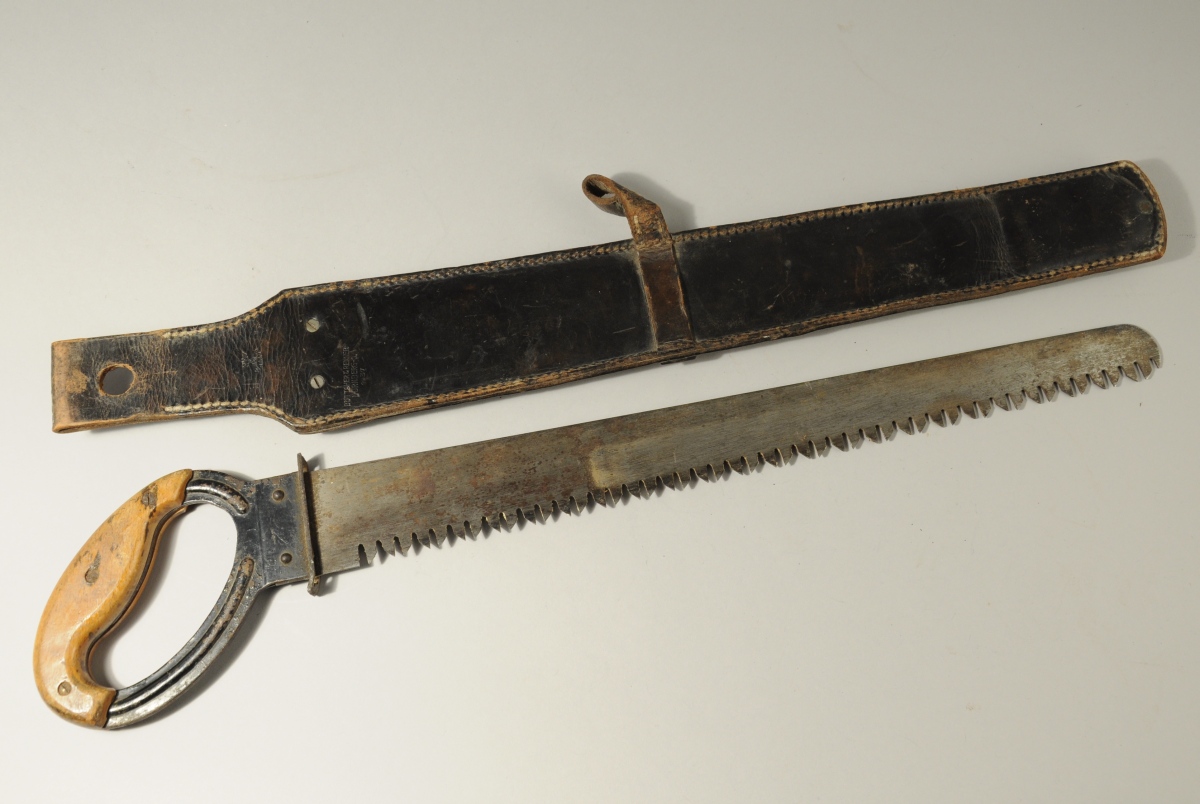 ALLEMAGNE. SCIE DE PIONIER, lame en acier marquée "F.A. SCHMIDT / REMSCHEID" à l'ancre centrée d'un coeur et numérotée "WaA727". Poignée en métal laqué noir à plaquettes de bois verni. Étui en cuir avec passant pour baionnette marqué "Böttcher & Renner / Nürnberg-0", daté 1937 et numérotée "Wa A40U".