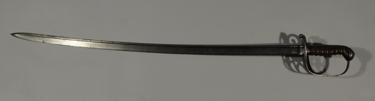 BRÉSIL. SABRE d'officier de cavalerie. Poignée en bois verni (manque filigrane). Monture, en fer, garde à quatre branches et médaillon gravé du chiffre du souverain Pedro II sous couronne. Lame cintrée à dos arrondi, gravée de rinceaux feuillagés des " Armes de Bragance" et du chiffre de Pedro II.