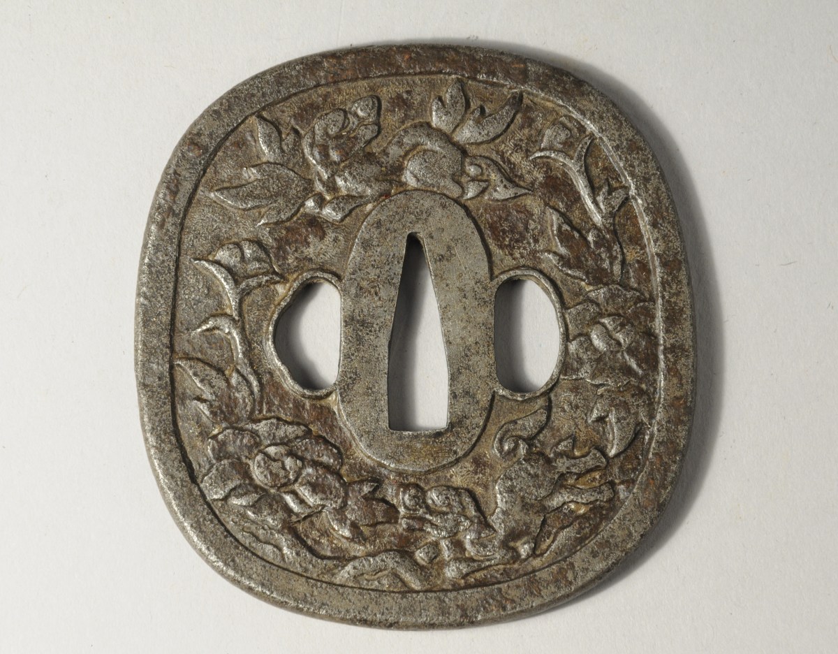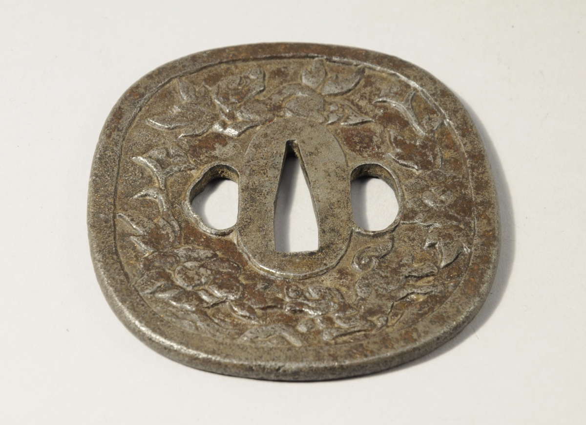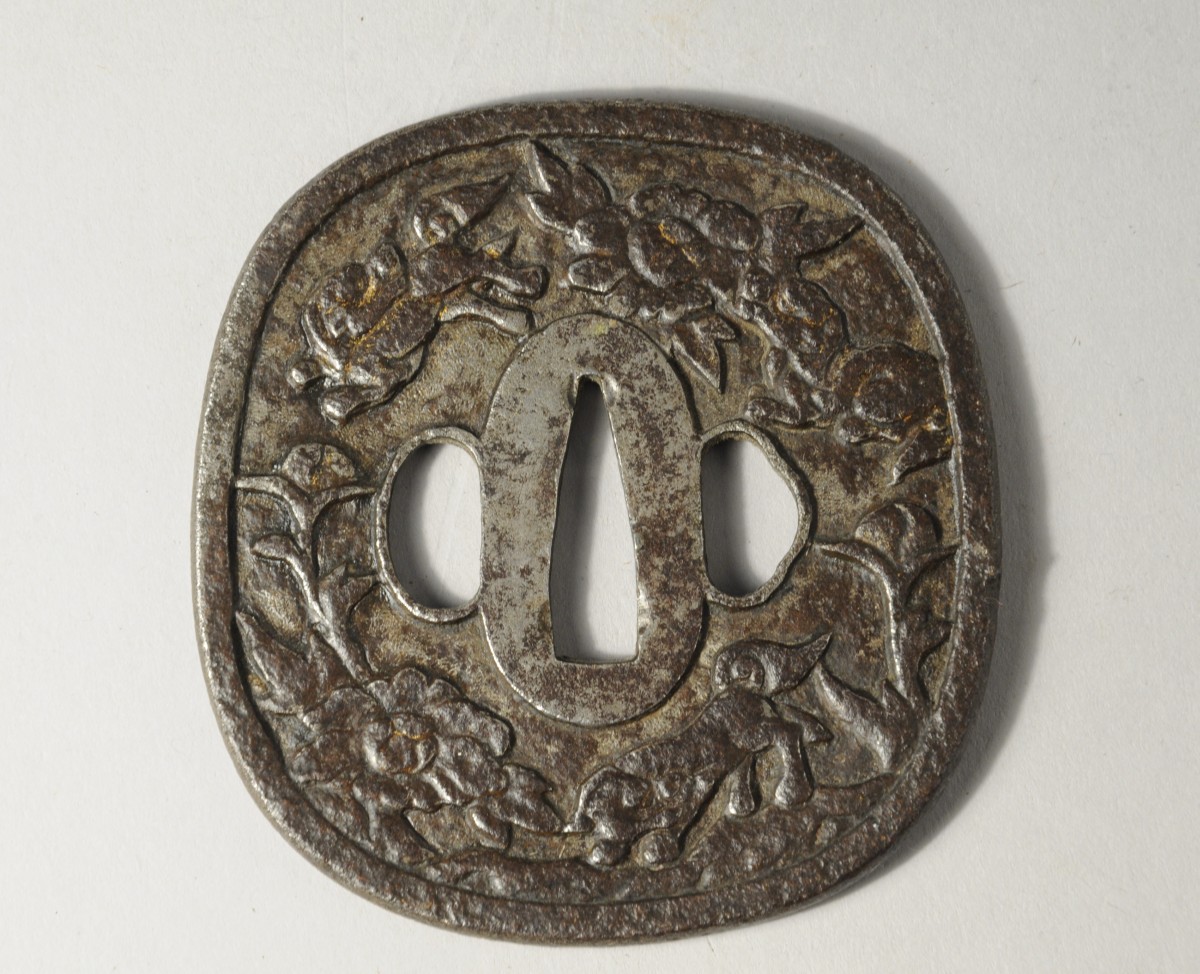 JAPON. TSUBA en fer à décor de chien et de motifs floraux.
