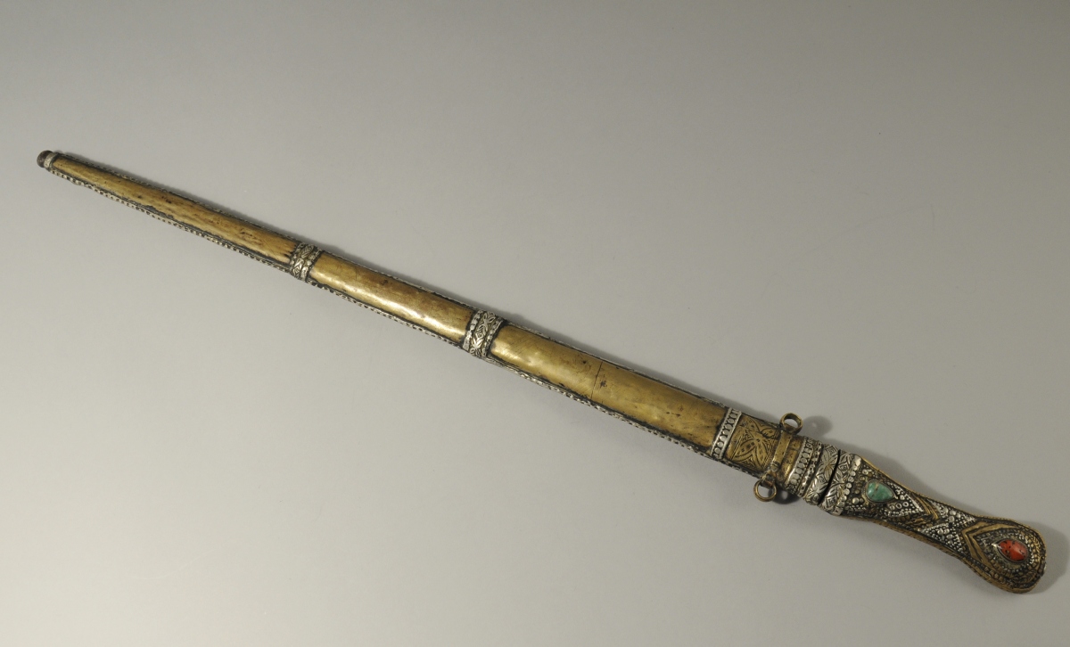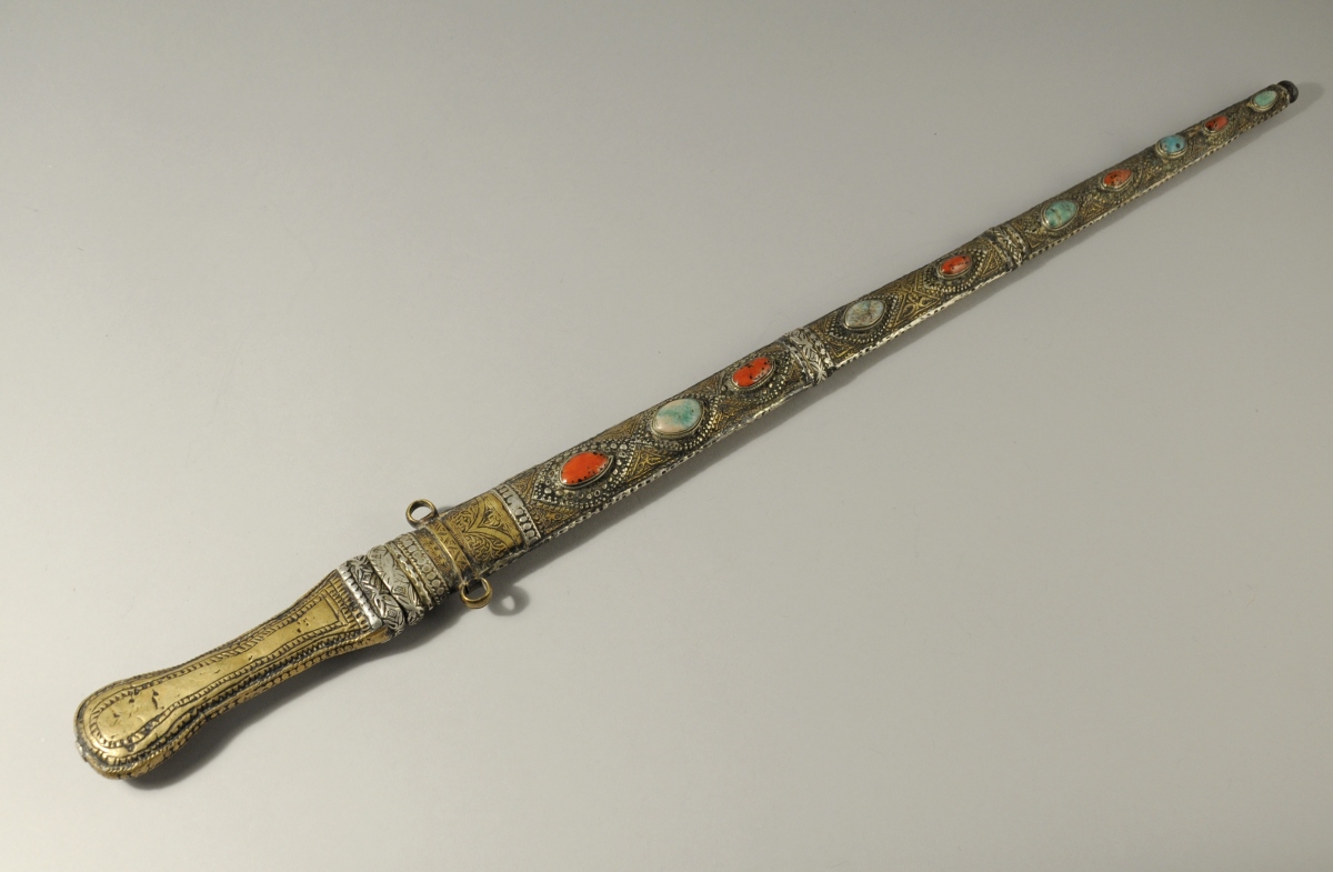 GRAND-SUD MAROCAIN. DAGUE en argent et laiton rehaussé de pierres semi-précieuse en cabochons. Fourreau à bagues, denticules et arabesques. Lame en métal à guirlandes stylisées.