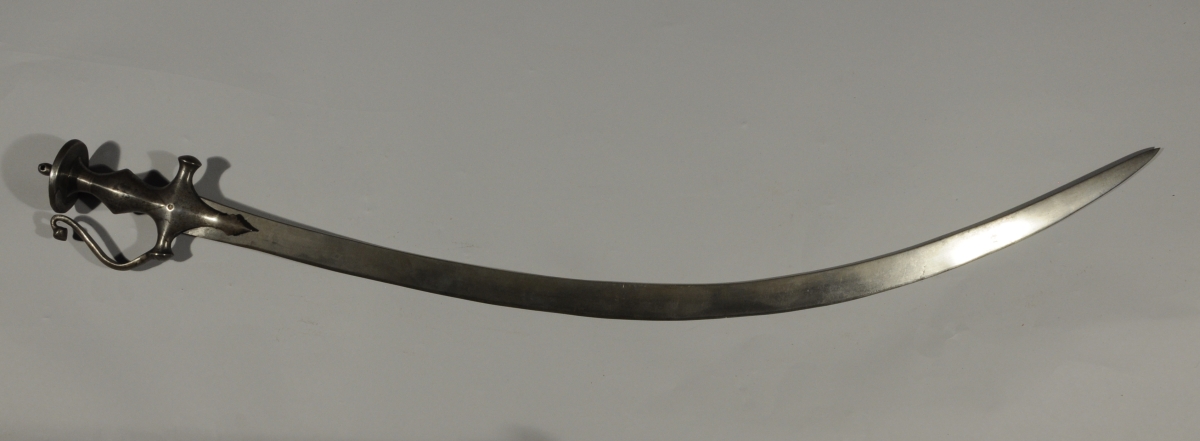 INDE. SABRE dit TALWAR. Poignée et monture en fer, garde une branche à deux quillons et oreilles. Lame courbe à dos plat.
