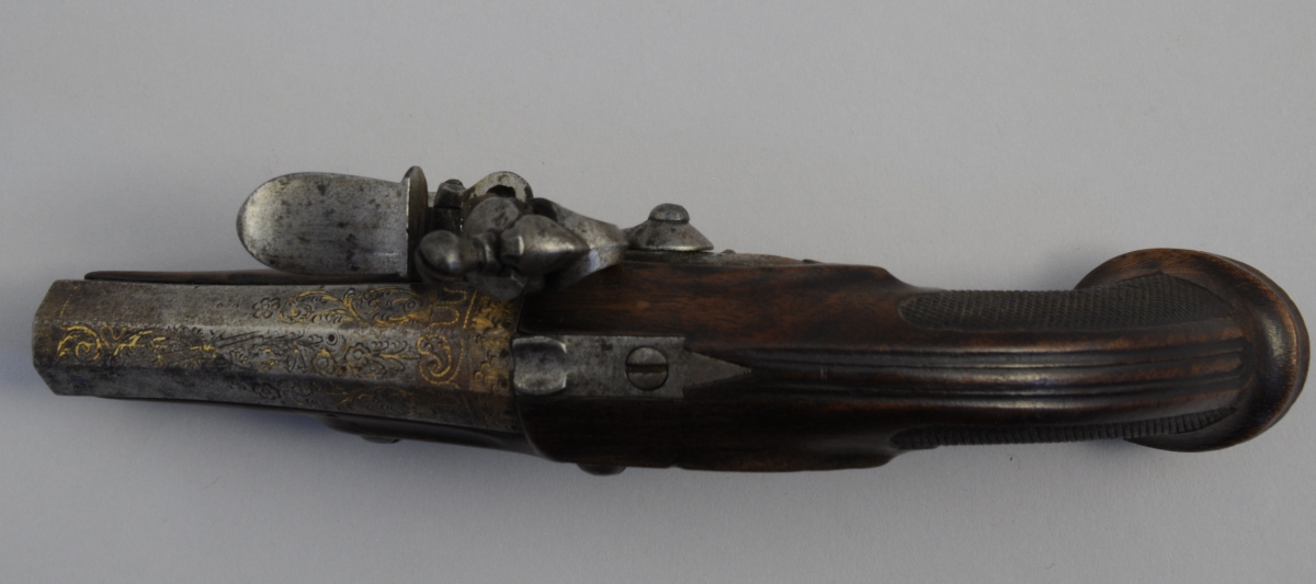 PISTOLET À SILEX DE VOYAGE OU D'OFFICIER. Canon à pans ciselé et doré de rinceaux et frises feuillagées, chien à col de cygne. Garnitures en fer. Crosse en noyer quadrillée et cannelée.